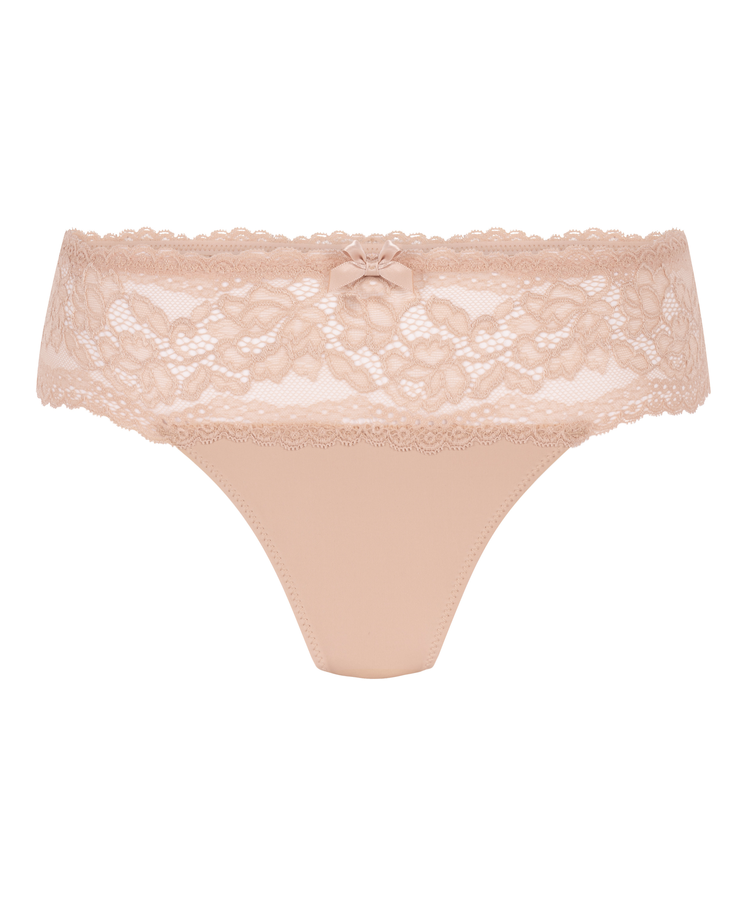 Sød og sensuel! Føl dig selvsikker i denne forførende hipster g-streng i blondestof. Kombiner med forskellige toppe og bh'er fra Hunkemöller. Det superkomfortable must, føles ny og bedre på hånden og er ekstremt blød og strækbar. Med smukke blomsterblonder, der gør stilen ekstra moderne.