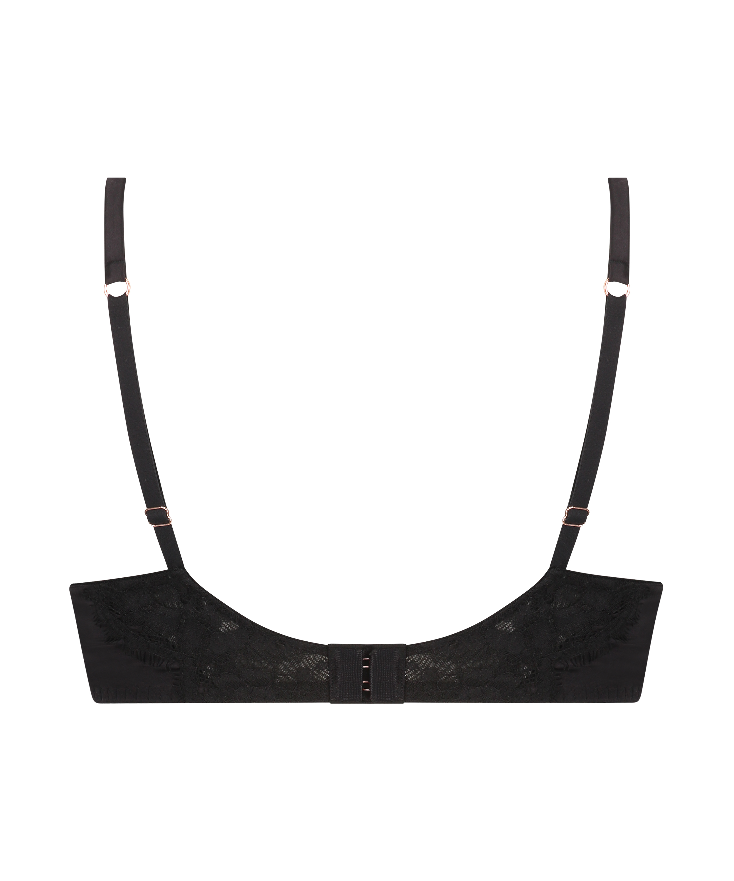 Vi er forelsket i denne fantastiske bh! Bh'en har blonde-detaljer og en lille sløjfe foran. Skulderstropperne kan justeres, så de kan tilpasses helt efter dine ønsker. Kombinér med de matchende artikler fra Noir-samlingen for at fuldende dit sæt!