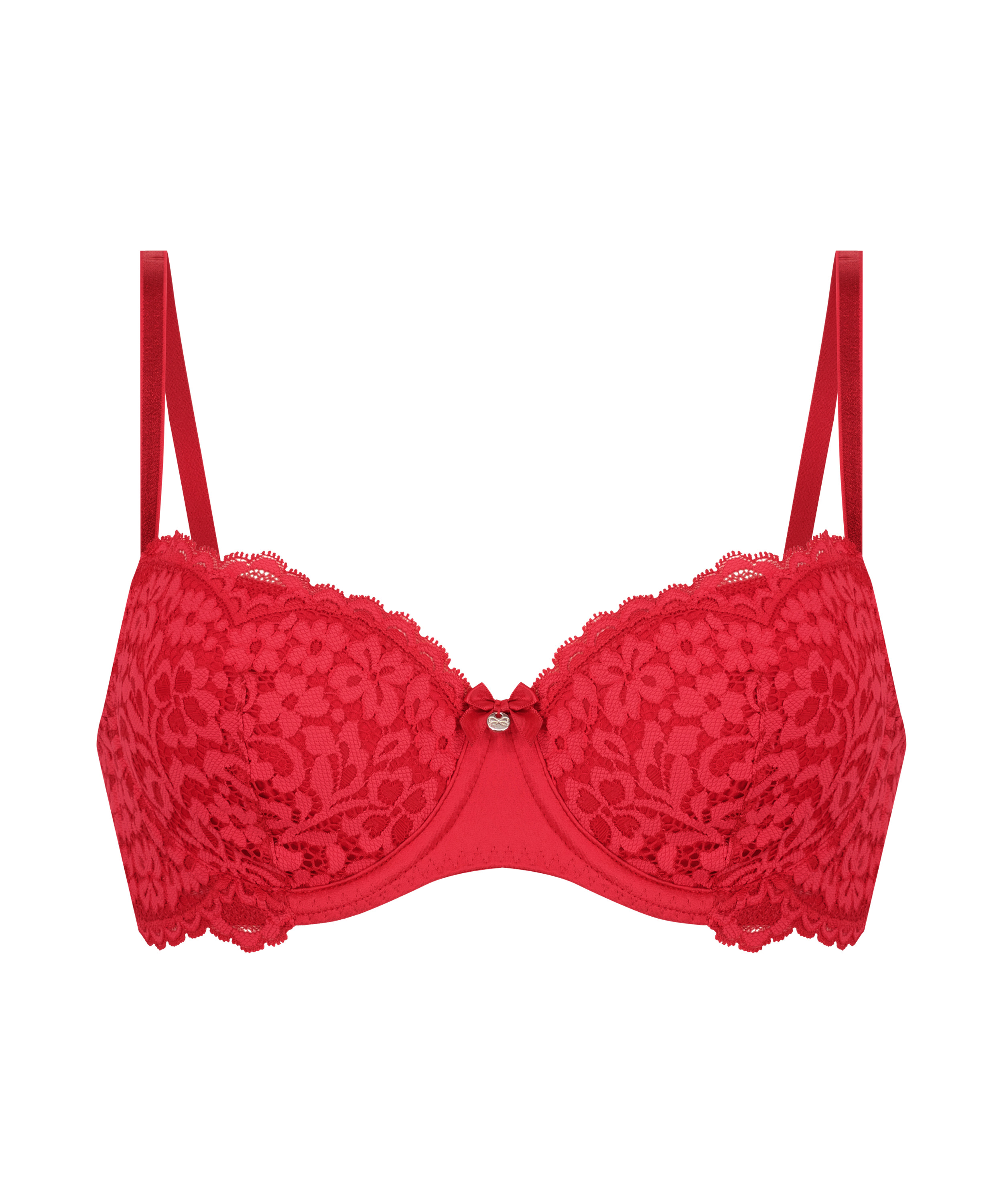Denne bh er et rigtigt must-have! Bh'en er trimmet med smukke blonder og har sjove detaljer som sløjfen og farvet stof, der vises under blonden. Kombiner den med de matchende trusser for et komplet sæt!