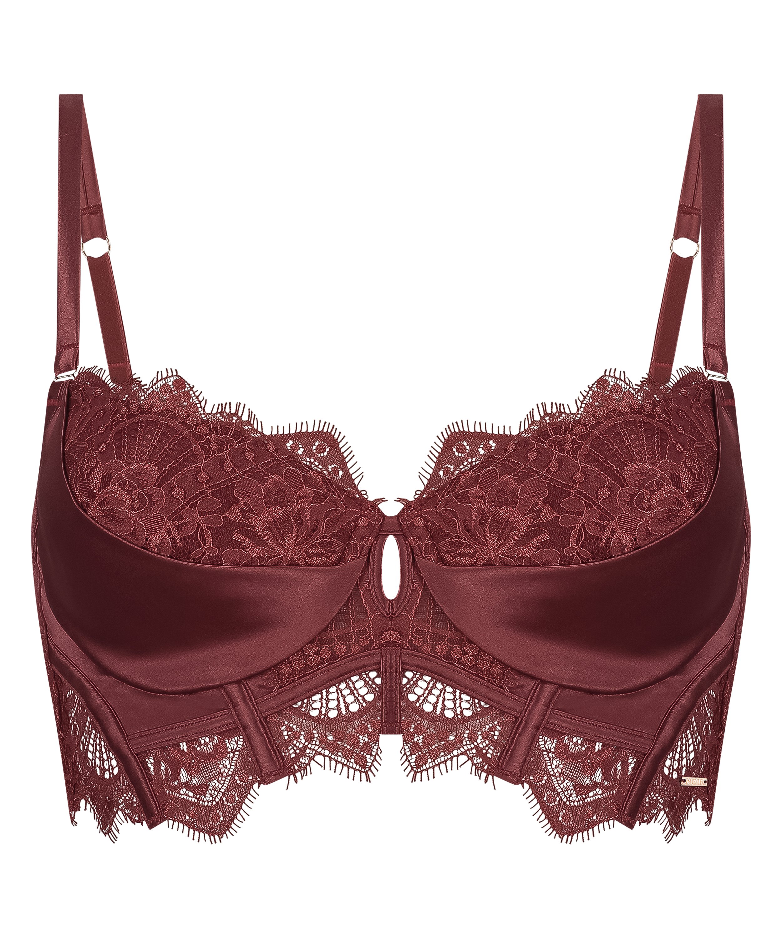 Føl dig forførerisk i denne formstøbte longline-bøjle-bh! Bh'en er udstyret med detaljer af blonder, mesh og satin og har derfor en luksuriøs udstråling! Blonden er ført igennem op på stropperne. Del af Noir-kollektionen.