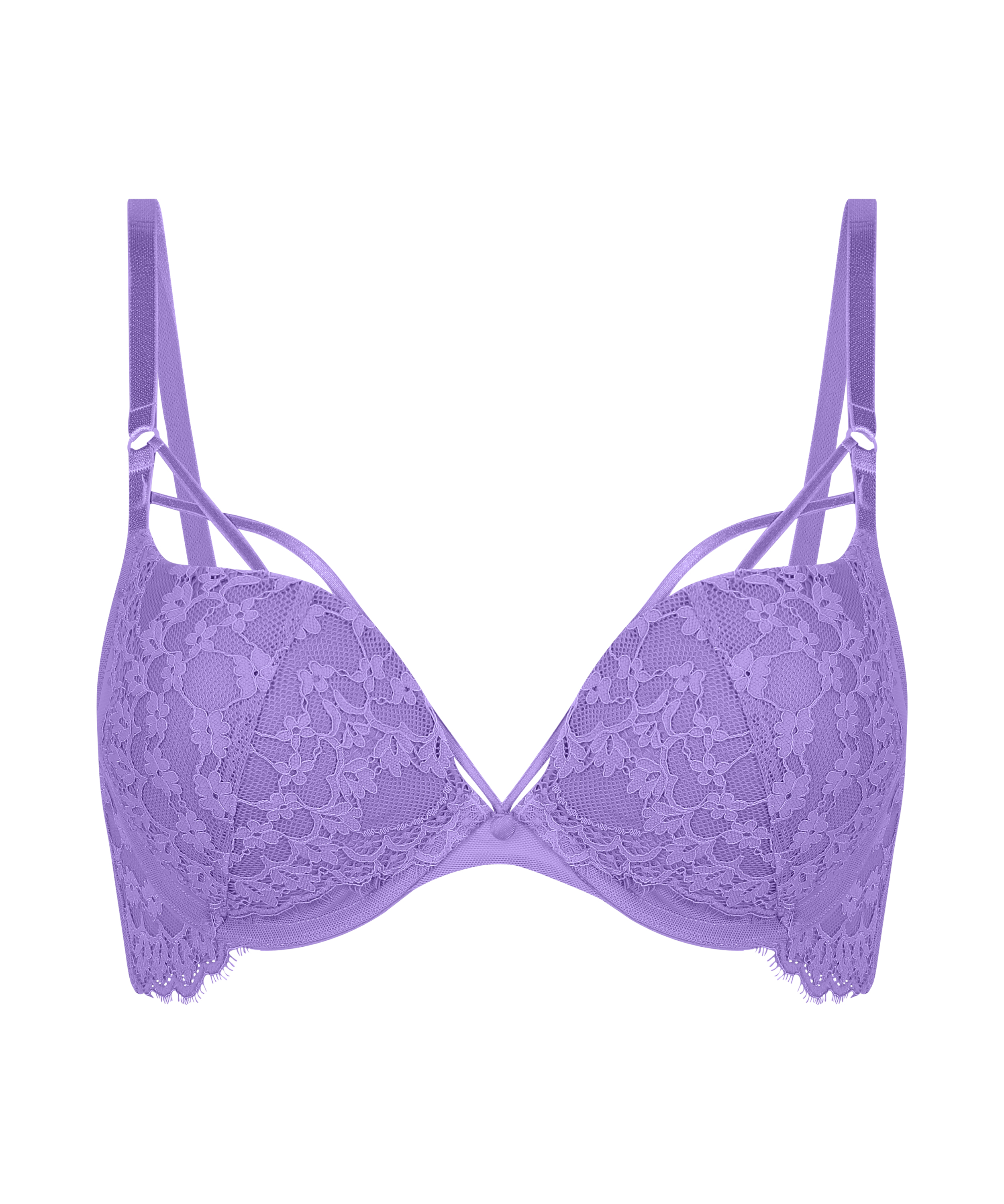 Denne behagelige maximizer-bh er din nye bedste ven! Med sjove stropdetaljer over brysterne kombineret med skåle med bøjle for et behagelit fit. Romantiske blondedetaljer sætter prikken over i'et. Sæt den sammen med matchende trusser!