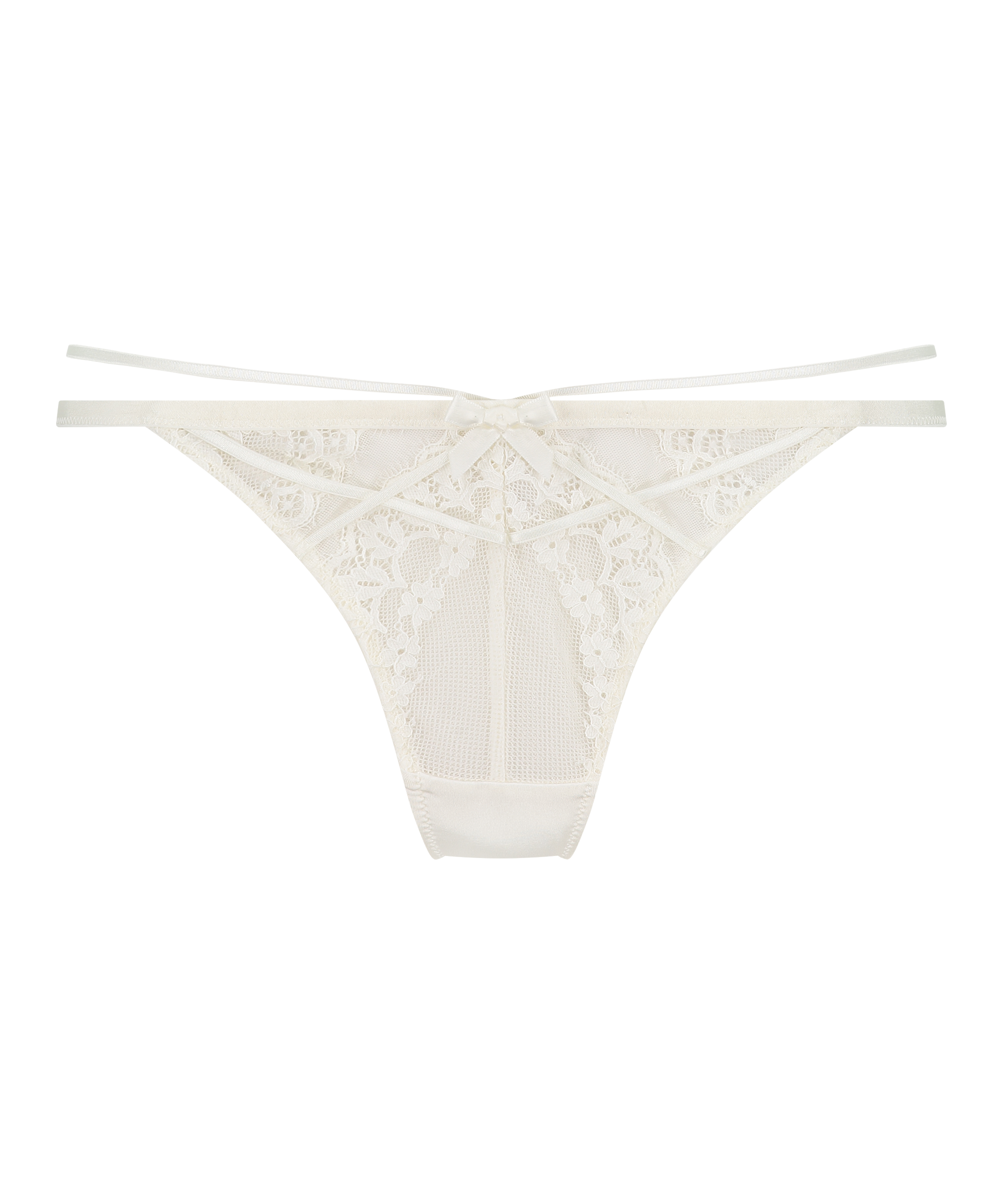 Denne trendy G-streng har en gennemsigtig blondefront og en bagside med mesh. En lille sløjfe midt på forsiden tilføjer et sidste strejf. Der er sjove snoredetaljer på forsiden og højt på hofterne. Sæt den sammen med den matchende bh!