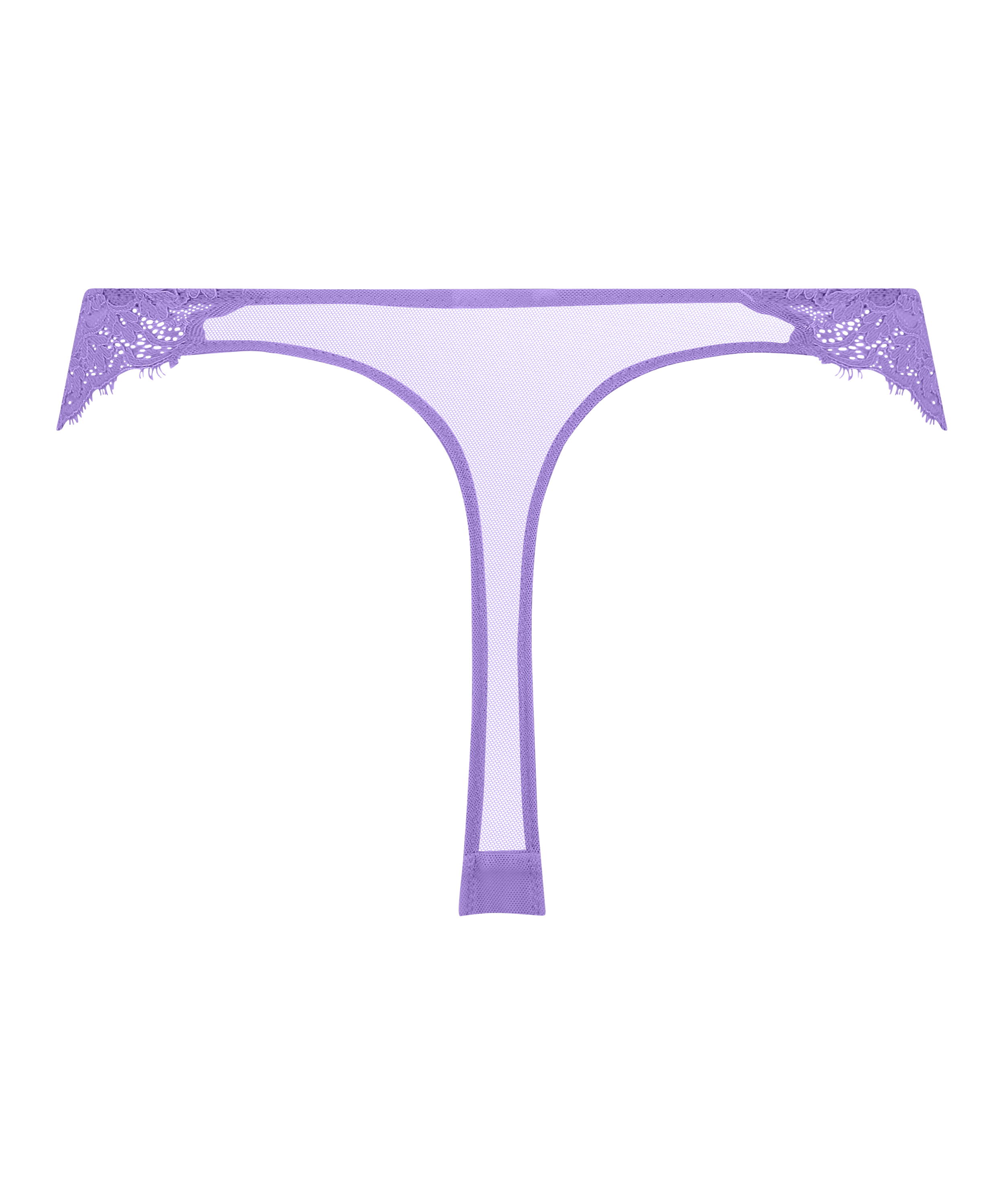 Trendy g-streng med transparant blondestof foran og mesh-stof bagpå. En lille knap i midten af fronten sætter prikken over i'et.