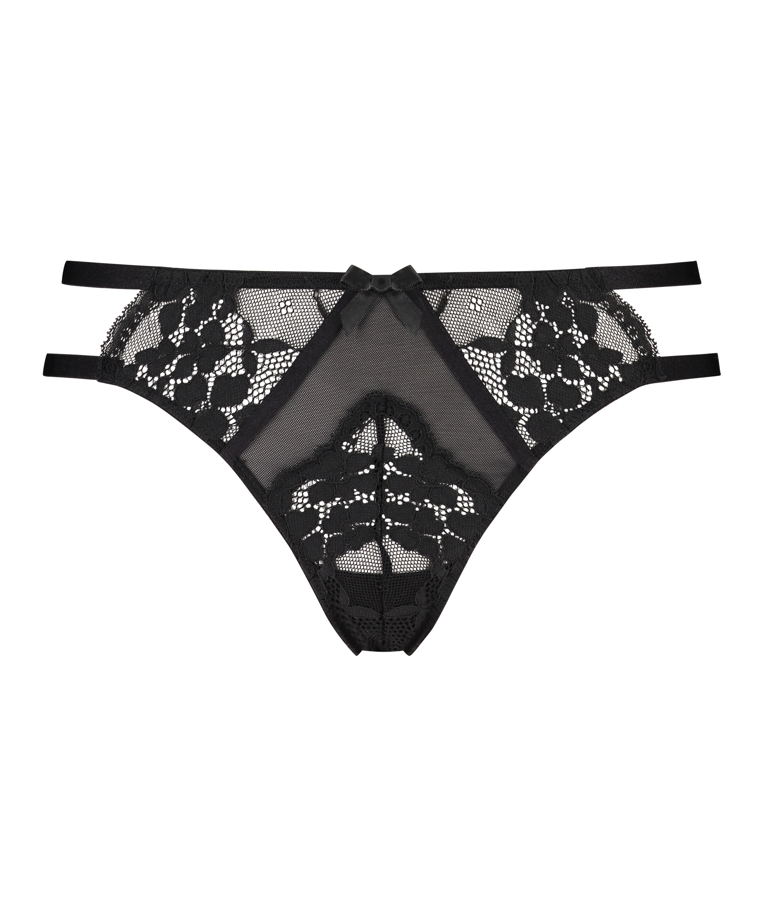 Føl dig sexet i denne smukke g-streng med blonder og detaljer med remme. G-strengen har en smuk sløjfe foran og viser lidt mere hud på hofterne. Match med passende bh.