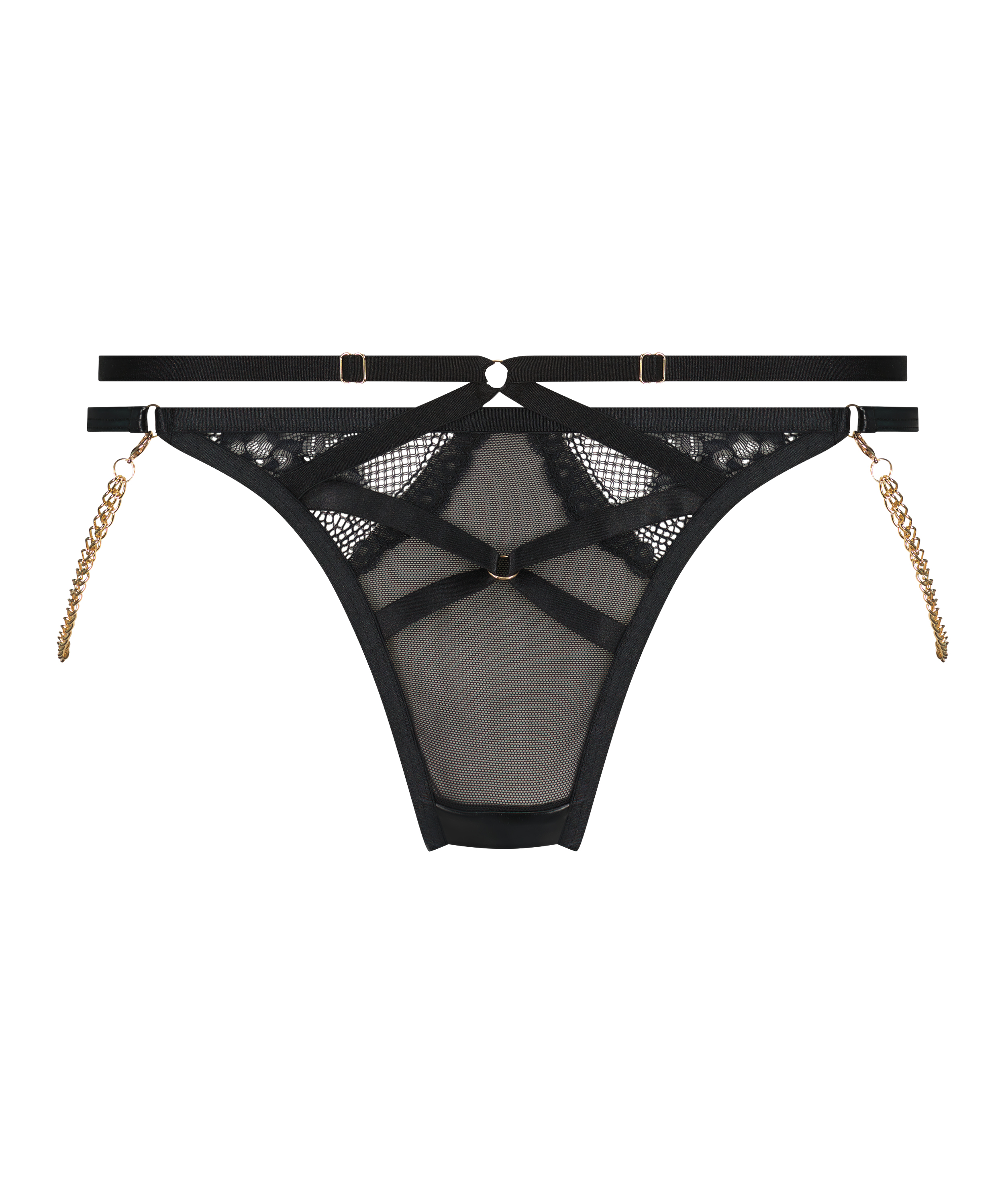 Tag dit lingerisæt til næste niveau med denne super sexede stringtros! Fremstillet af mesh-materiale, dekoreret med blonder og stropper for et krydret look. Der er en udskåret detalje på bagsiden, og thong er dekoreret med en aftagelig gylden kæde. Match med Hecate bustier for at fuldende sættet!
