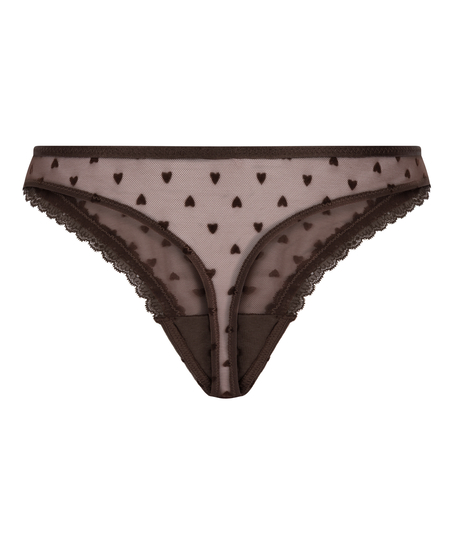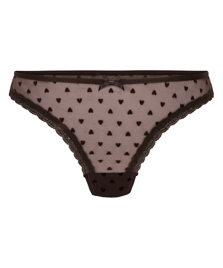 Føl dig veltilpas i denne pæne g-streng. G-strengen har en blondekant og detaljer i form af fløjlshjerter. Sæt den sammen med din yndlings bh som kronen på værket.