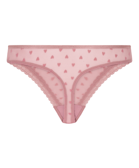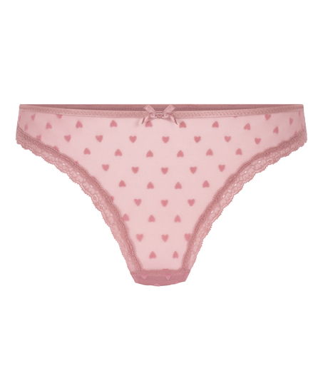 Føl dig veltilpas i denne pæne g-streng. G-strengen har en blondekant og detaljer i form af fløjlshjerter. Sæt den sammen med din yndlings bh som kronen på værket.