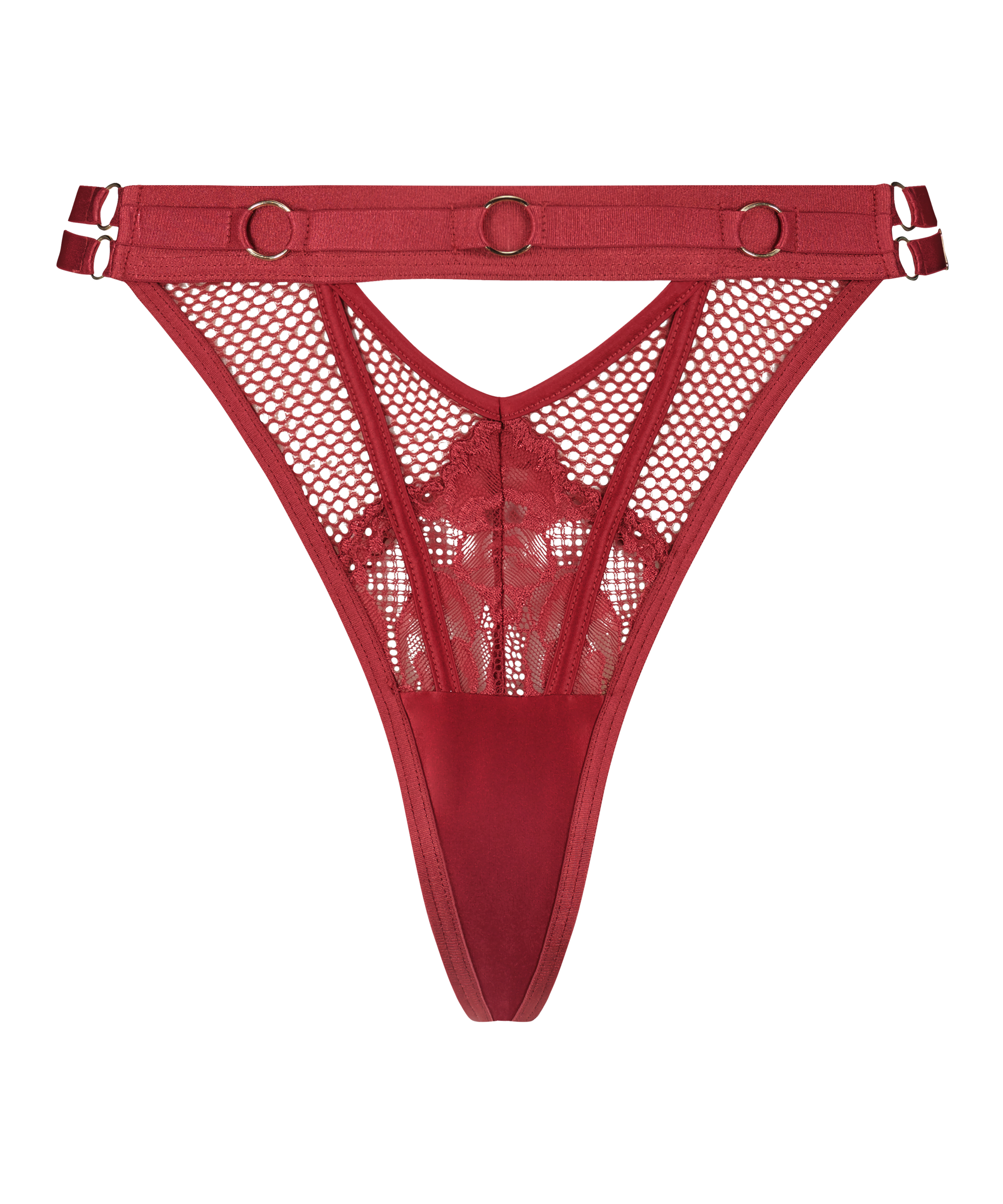 Denne supersexede g-streng er i en helt ny liga. Den er fremstillet af fiskenetmateriale og er pyntet med blonde og snøredetaljer, som giver et pikant look. Der er udskæringsdetaljer for og bag sammen med metaldetaljer på det brede bånd. Find den tilhørende corsage, og fuldend looket!