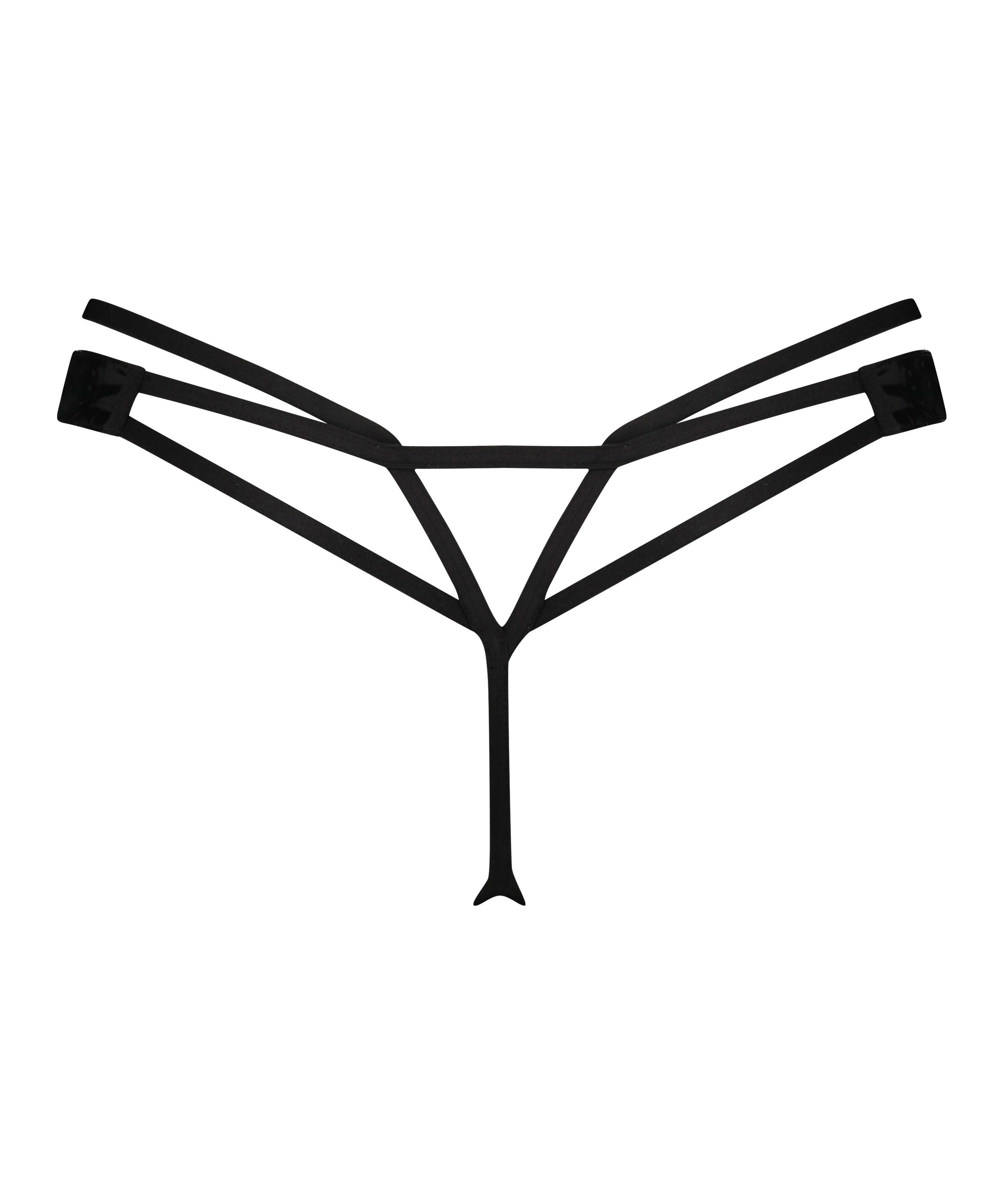 Denne g-streng er mere sexet end nogensinde! Trussen har detaljer som bånd og udskæringer, ligesom der er anvendt noget blankt stof i den. Foran hænger der også en ring fra strengen som en ekstra detalje. Match med tilhørende bh for at få et komplet look.