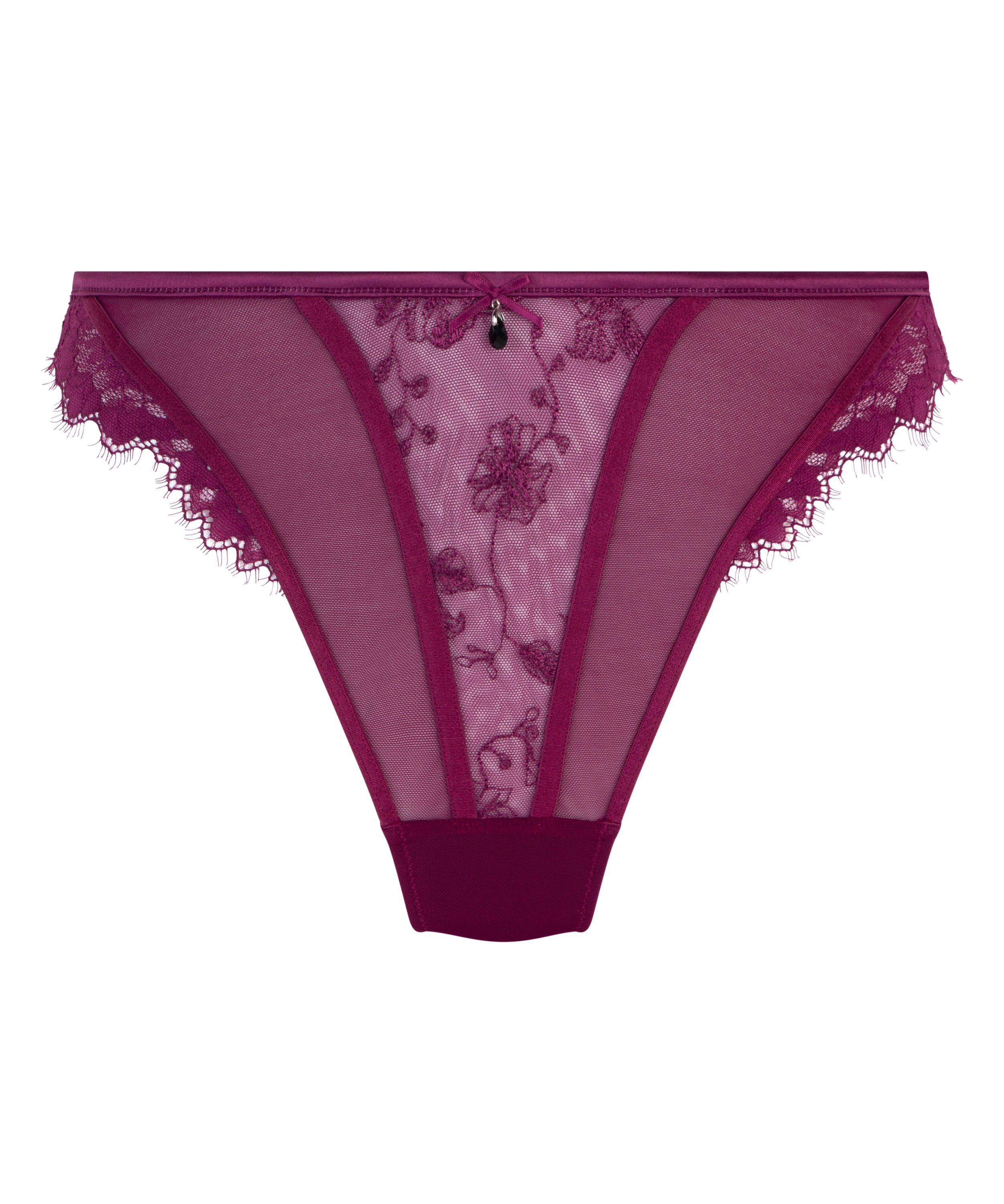 Nyd denne superfine, broderede mesh-G-strengs luksuriøse, delikate fornemmelse! Blomsterinspireret design bugter sig på for- og bagsiden, og tilføjer bevægelse og flatterende definition. Denne smukt designede G-streng fuldendes med en fin sløjfe og lille, dekorativ sten. Bær den med den matchende Sia-bh eller bustier for et fantastisk, fuldendt look!