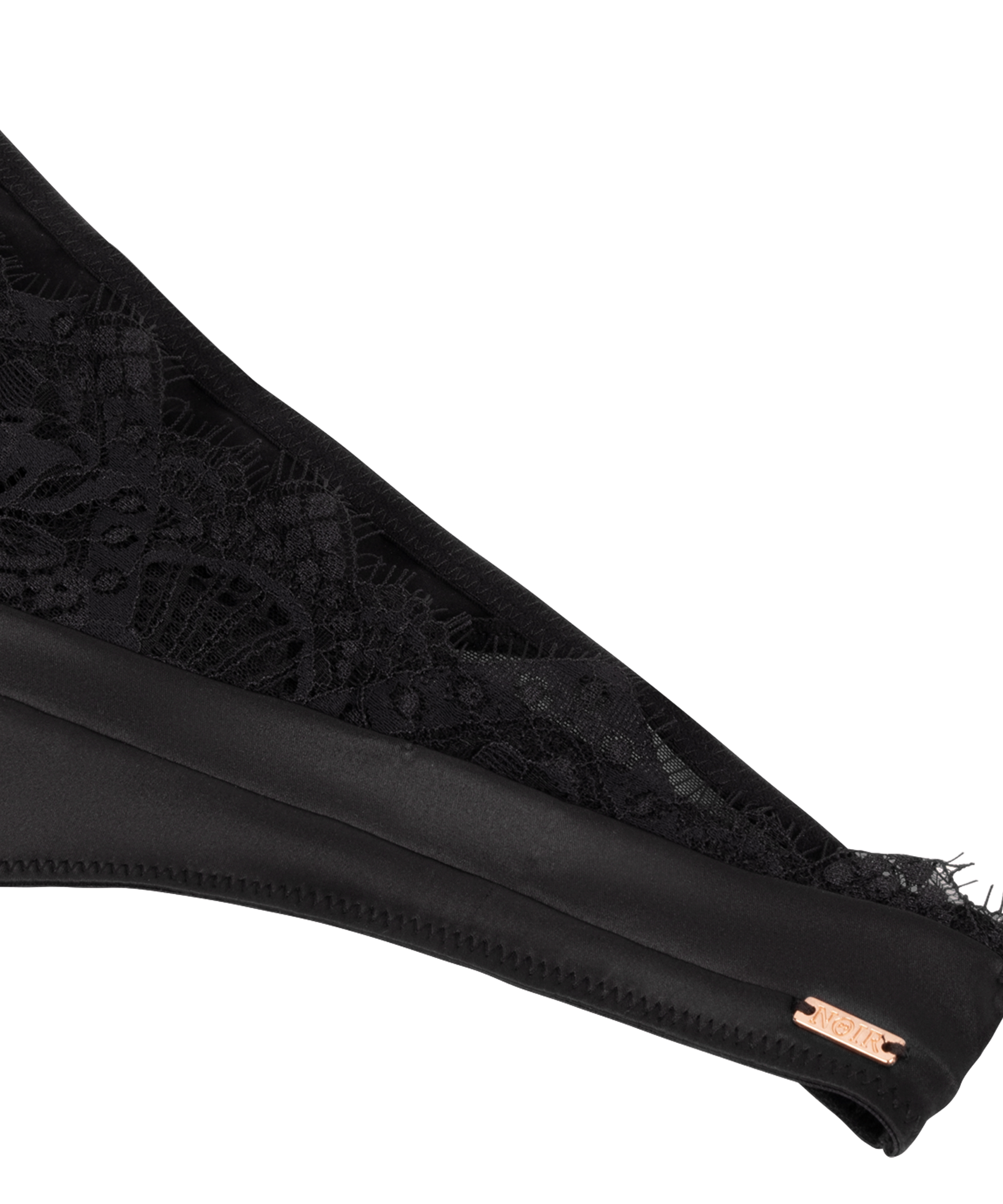 Fuldend dit sæt med denne smukt udstyrede g-streng. G-strengen er forsynet med smukke og luksuriøse detaljer af blonder, satin og mesh. Den er forsynet med en sløjfe. Del af Noir-kollektionen.