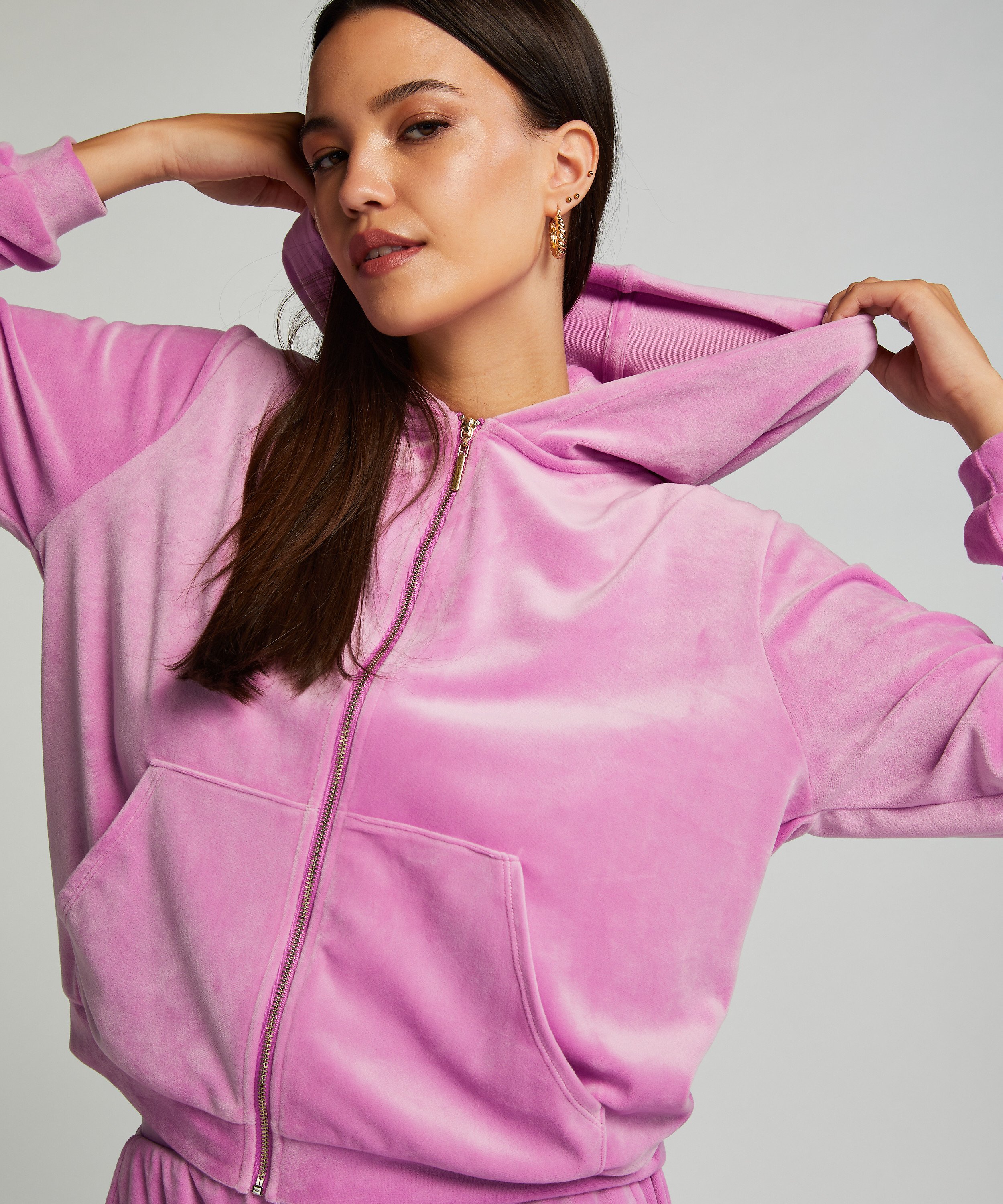 Hættejakke velour - Lyserød