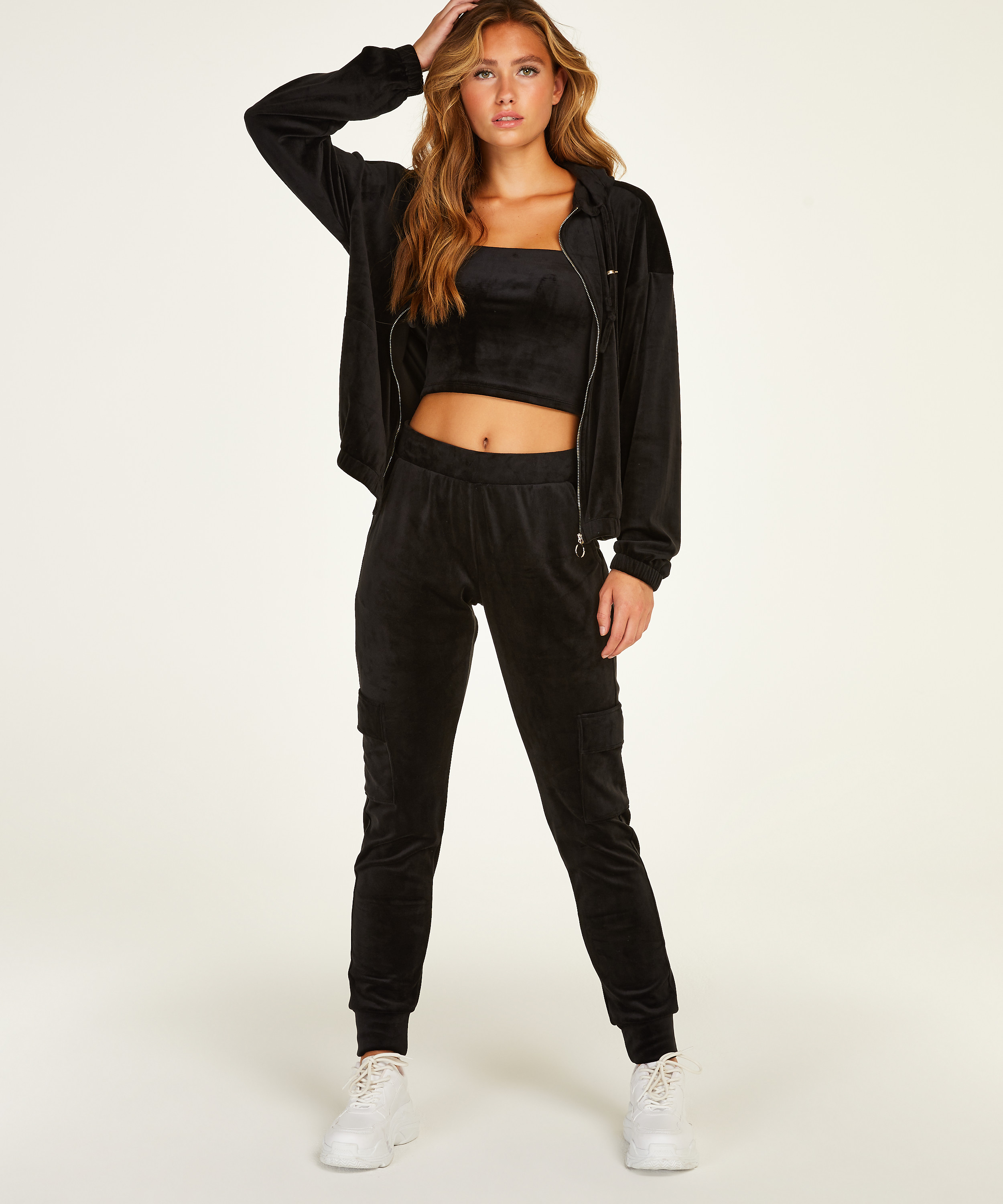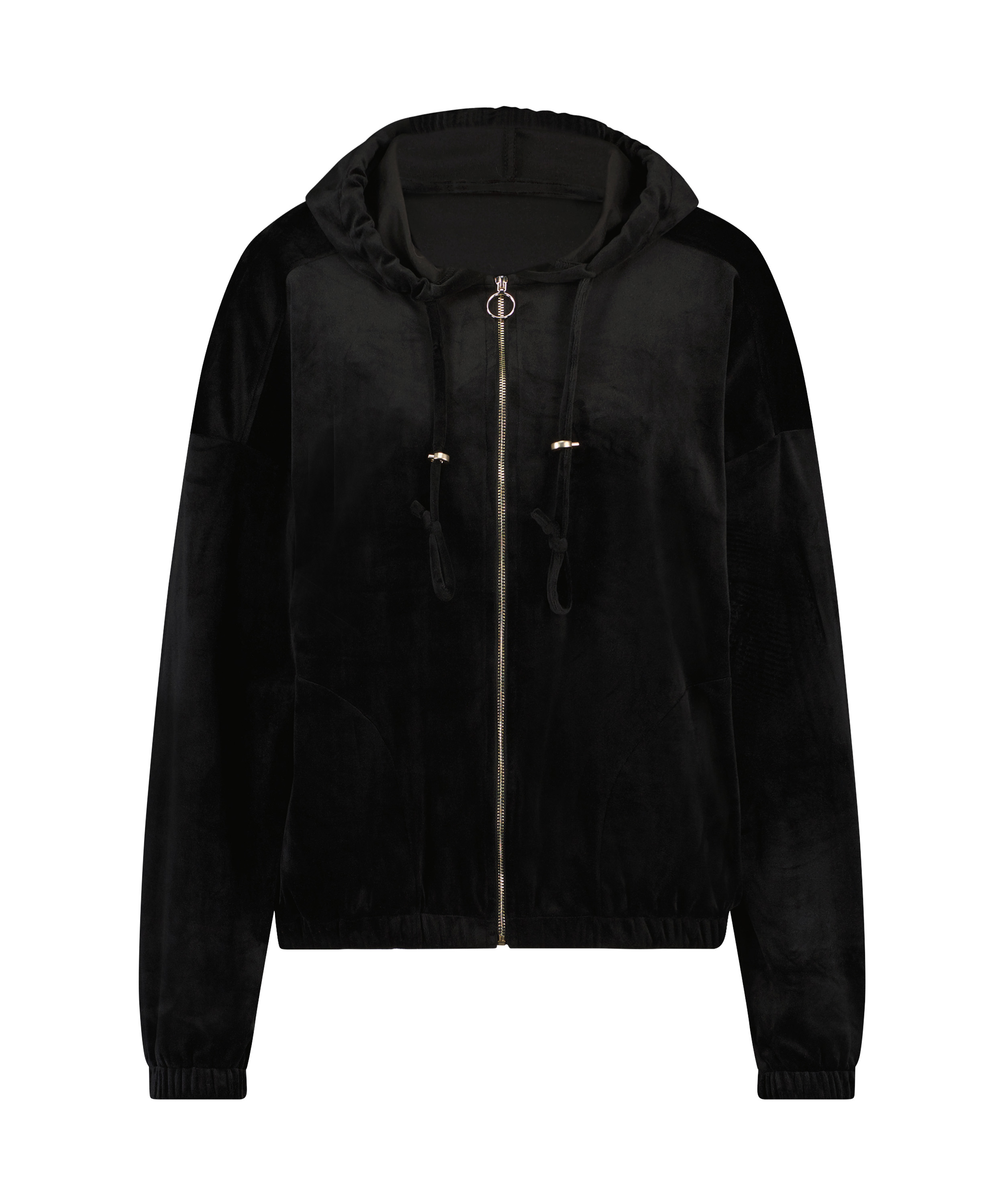 Nyd denne jakke med hætte! Denne jakke består af et blødt stof og har lynlås foran. Der er lommer i begge sider. Kombiner med matchende bukser og få en fantastisk behagelig følelse.