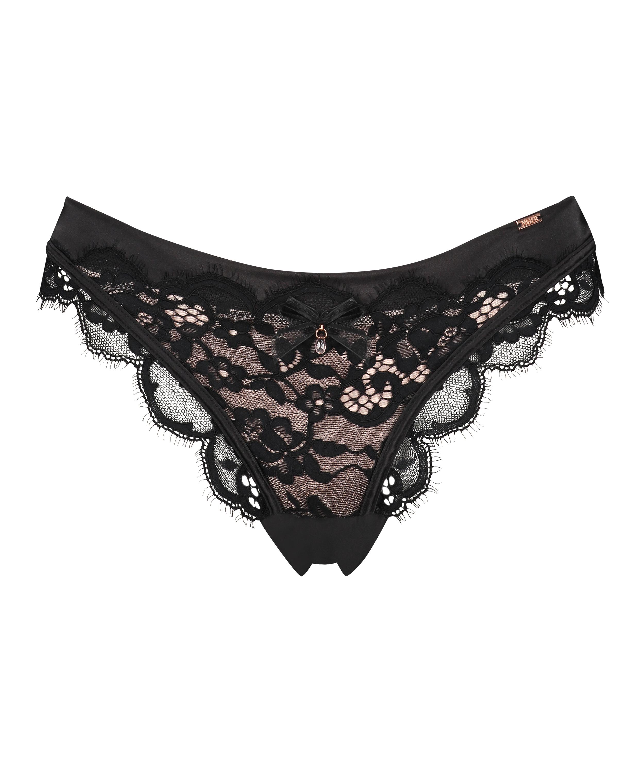 Denne brasilianske trusse ser ud og føles som satin og har skønne blondedetaljer. Den lille sløjfe foran giver et feminint touch. Bagstykket i meshstof understreger dine balder. En artikel fra Noir-kollektionen.