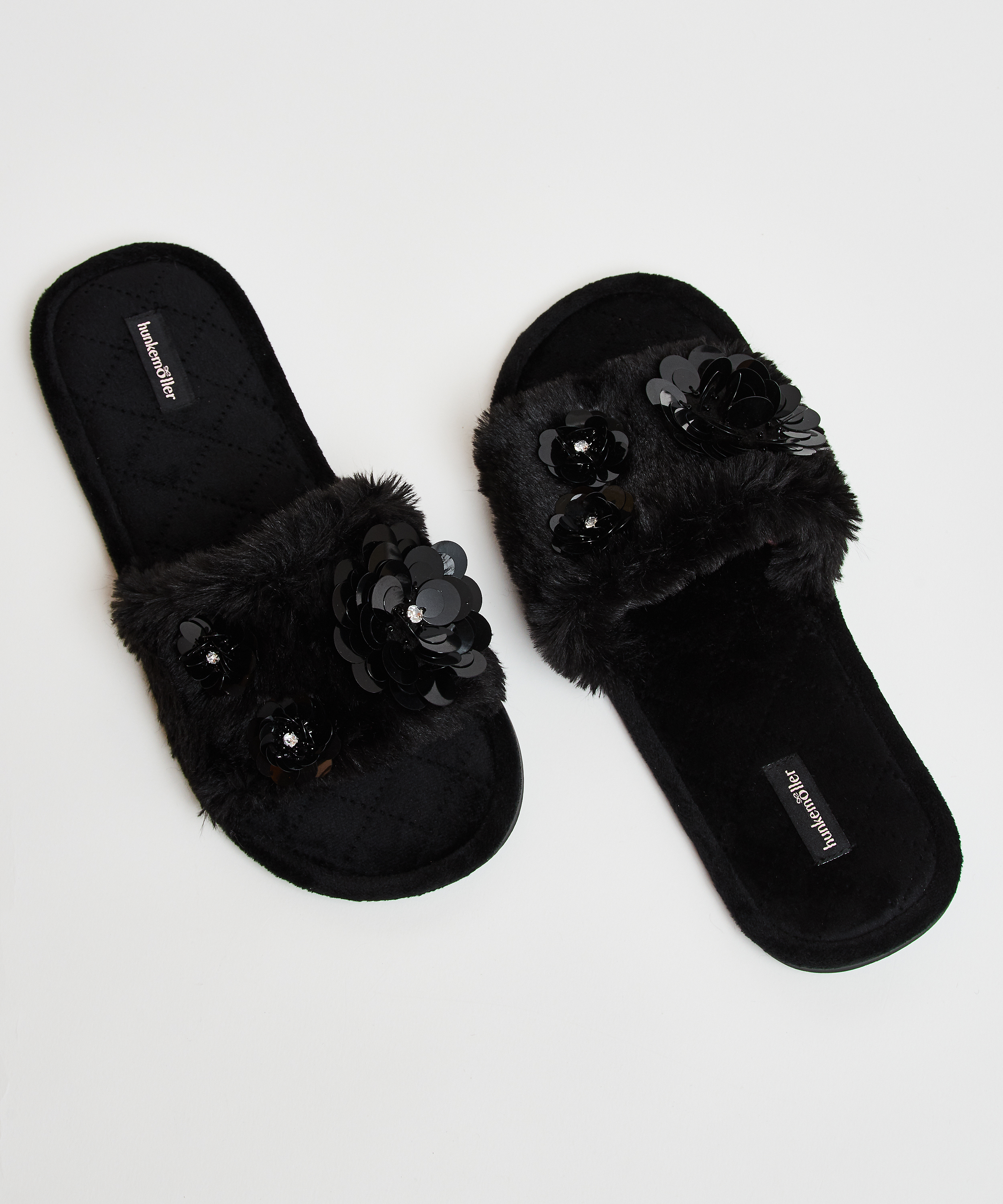 Fuldend dit aften-look med disse sjove hjemmesko! Hjemmeskoene har hårde såler, en blød indersål og detaljer af falsk pels med blomster. Kombinér med et matchende sæt nattøj for et komplet sæt!