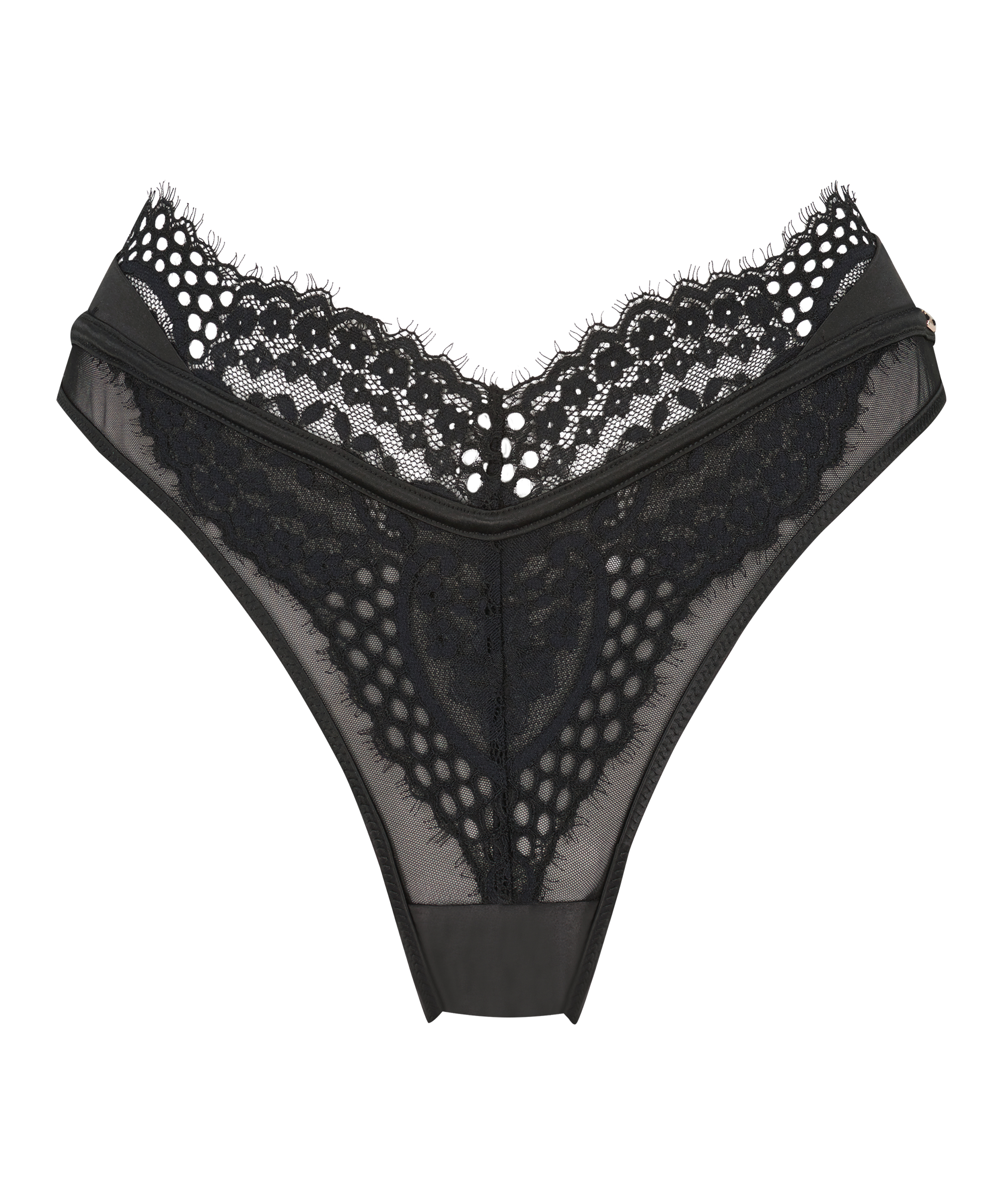 Føl dig selvsikker i denne høje brasilianske trusse! Den brasilianske trusse har blonde- og meshdetaljer og er pyntet med flot satinstof. Kombinér med en passende bh for at få et komplet sæt! Del af Noir-kollektionen.