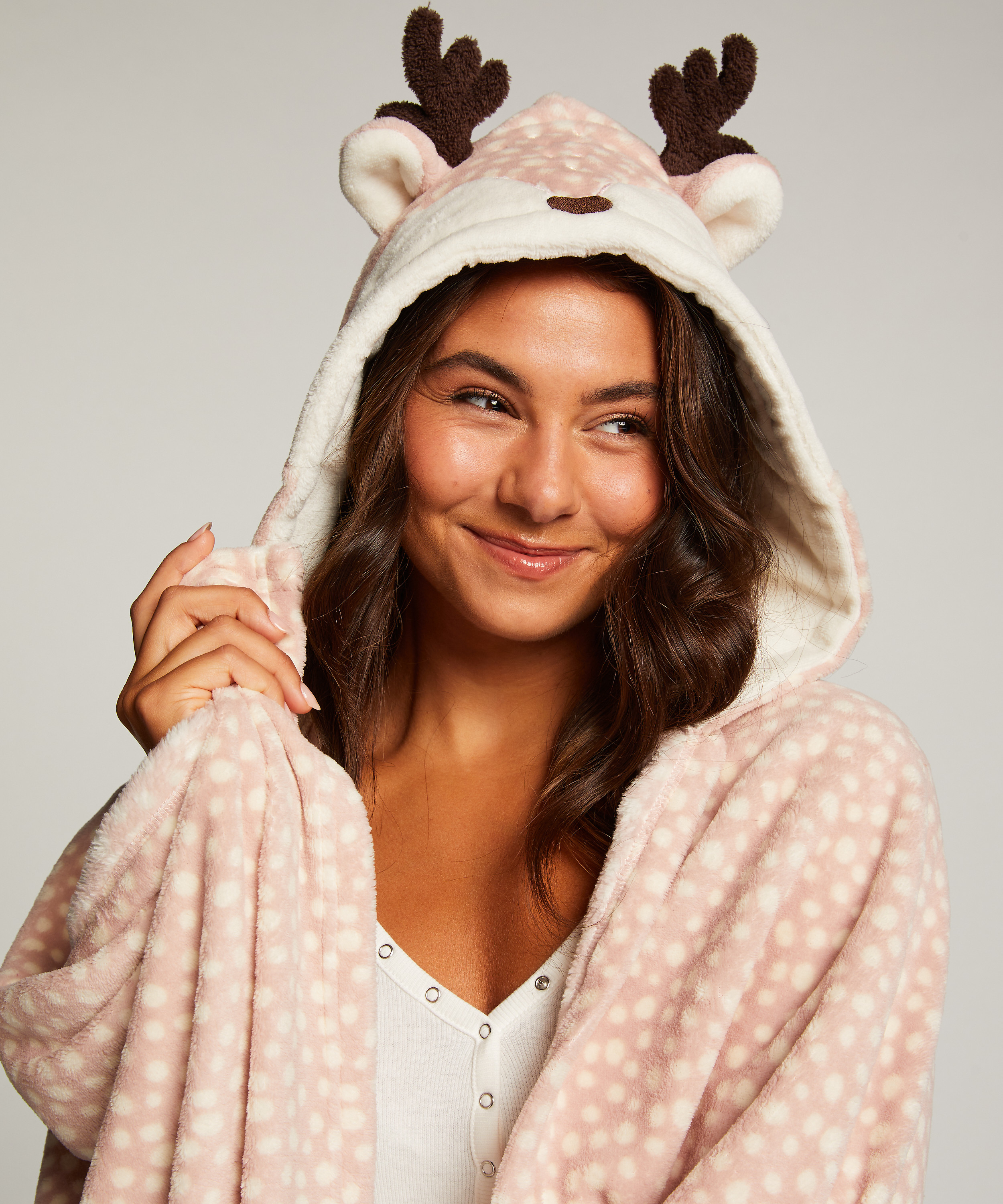 Dejligt om vinteren! Dette fluffy tæppe holder dig dejlig varm. Udført med en hætte med rensdyrdetaljer 125 cm × 170 cm.