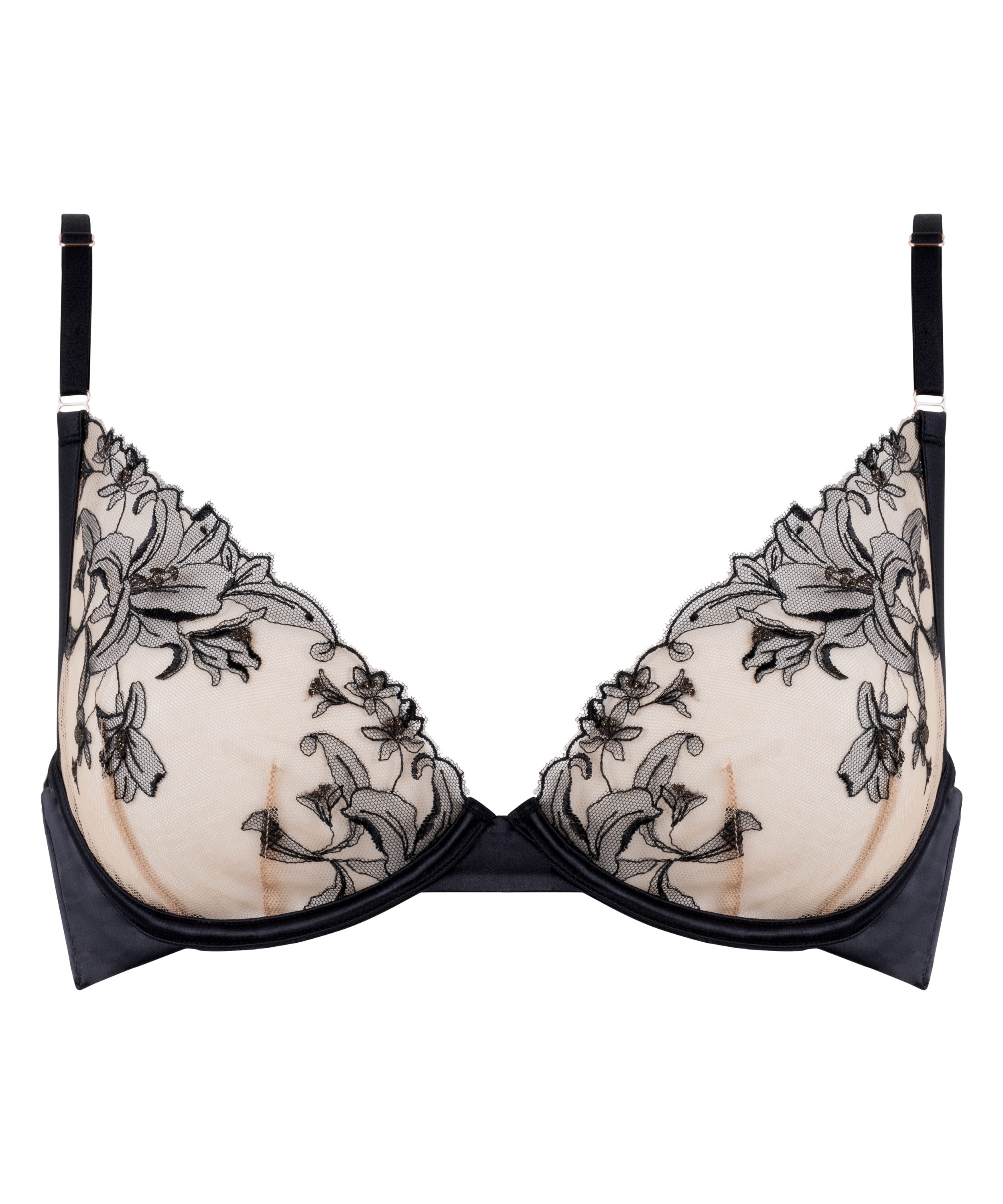 Denne bh er vidunderlig! Denne ikke-formstøbte bh har bøje og justerbare skulderstropper. Den er fremstillet af et smukt blondemateriale, som giver et romantisk halvgennemsigtigt look. Sættes sammen med de matchende trusser. En del af vores Noir-kollektion.