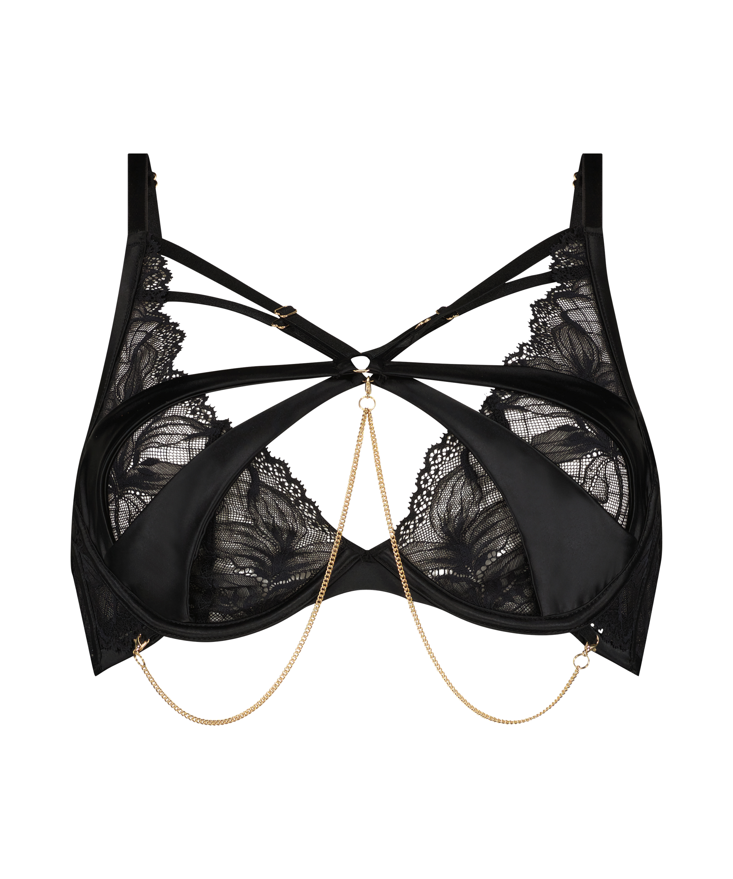 Denne sexede bh er helt fantastisk! Den har justerbare skulderstropper og skåle med bøjle for mere komfort. Blonderne foran og den aftagelige gyldne kæde giver denne bh et sexet look. Kombiner den med matchende trusser. En del af vores Private Collection.