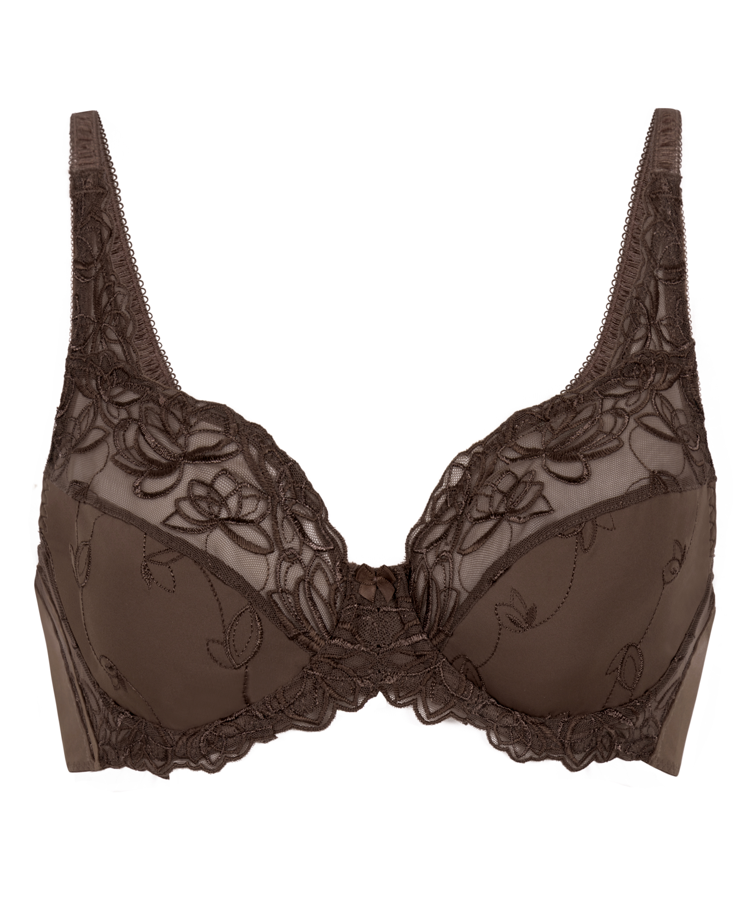 Ikke-formstøbt bøjle-bh i uigennemsigtigt stof med halvtransparente blonder øverst på skålene. Skålene er dekorerede med et elegant blomstermotiv. Fuldend sættet med matchende Diva trusse.