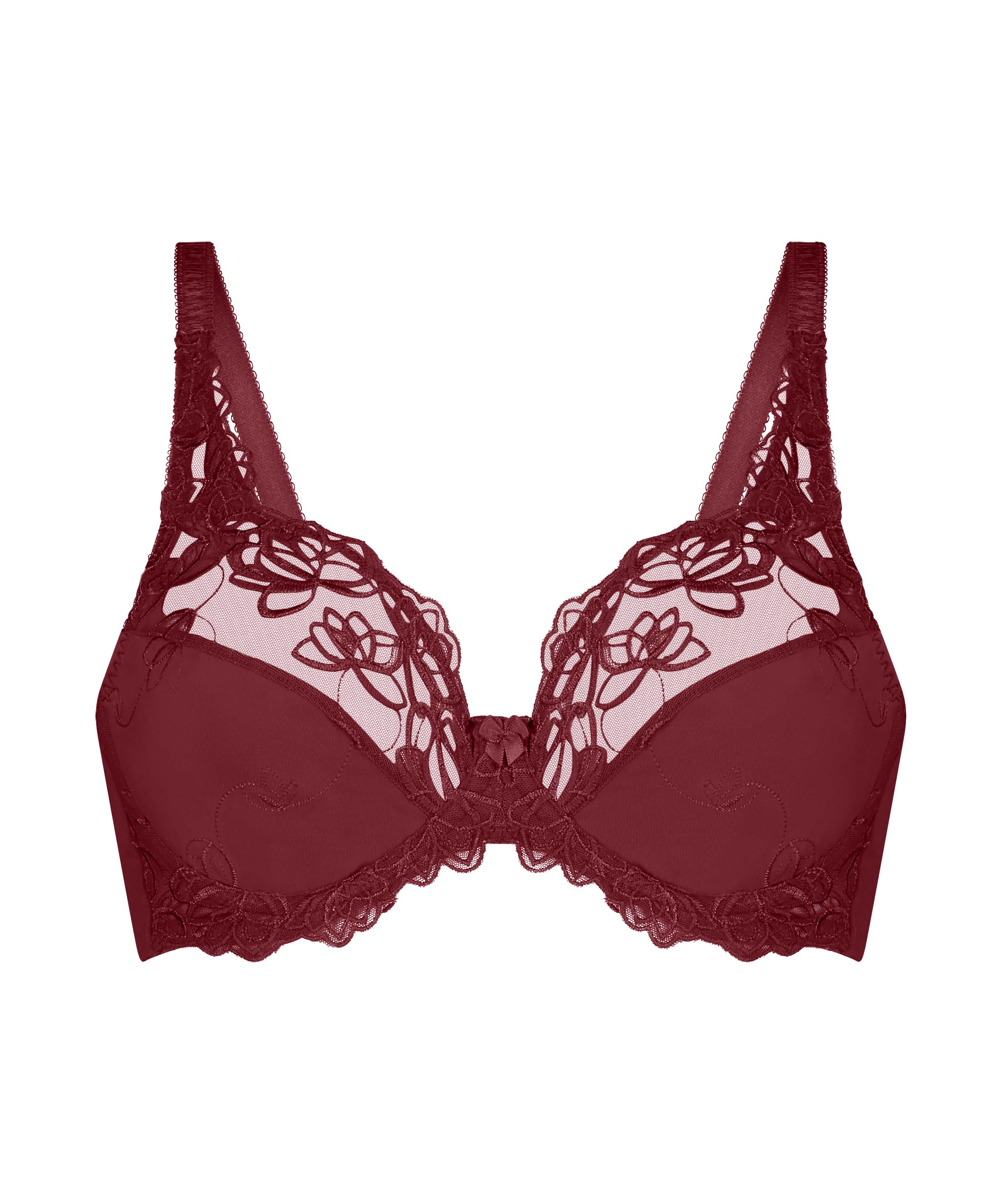 Ikke-formstøbt bøjle-bh i uigennemsigtigt stof med halvtransparente blonder øverst på skålene. Skålene er dekorerede med et elegant blomstermotiv. Fuldend sættet med matchende Diva trusse.