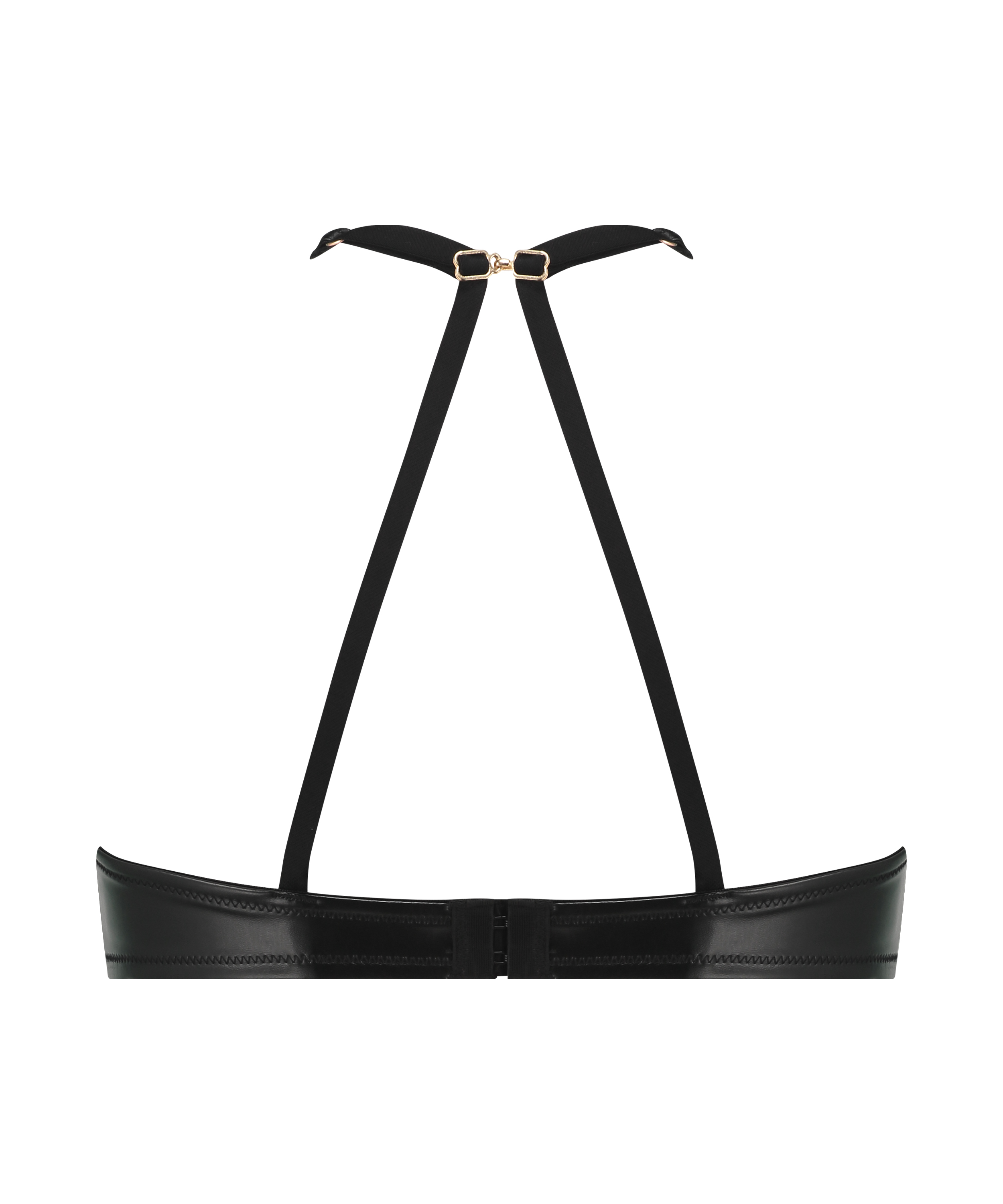 Denne bh er designet med et elegant sort imiteret læderdesign med fine gulddetaljer. Den dybe udskæring giver et dristigt touch, mens de justerbare stropper sikrer en skræddersyet pasform. De understøttende skåle giver støtte og form. Bh'en er designet til at fremhæve din figur og give et glamorøst look.