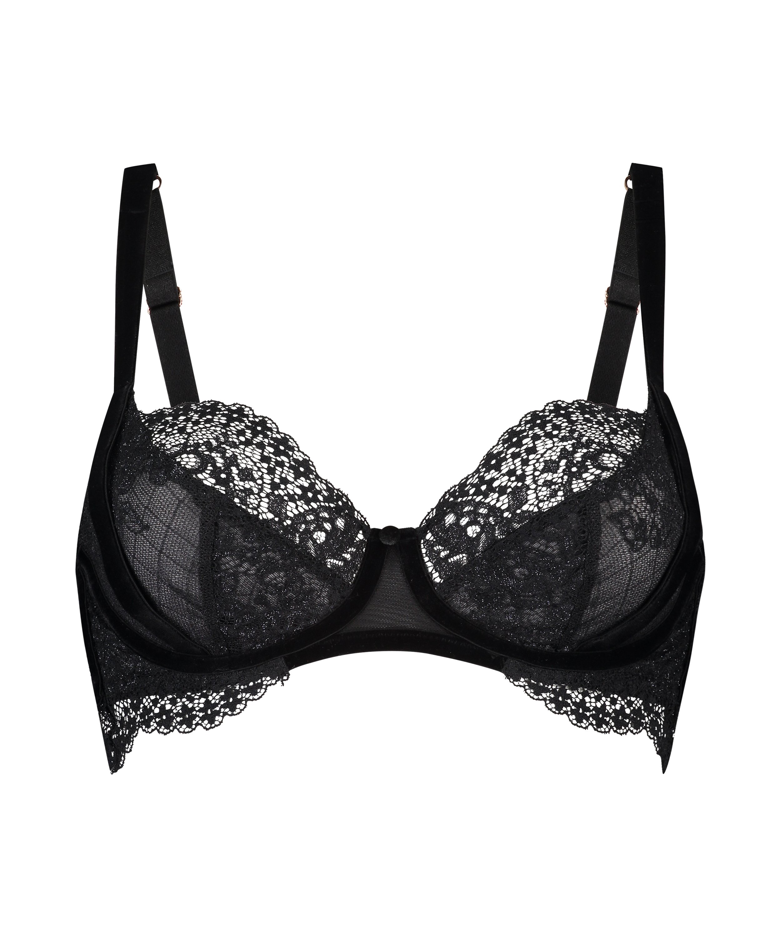 Denne ikke-formstøbte bøjle-bh er forsynet med mange halvtransparente blonder og fløjlsdetaljer, derfor supersexet! Fuldfør dit sæt med et par af de mange matchende trusser! En del af Rebecca Mir kollektionen.