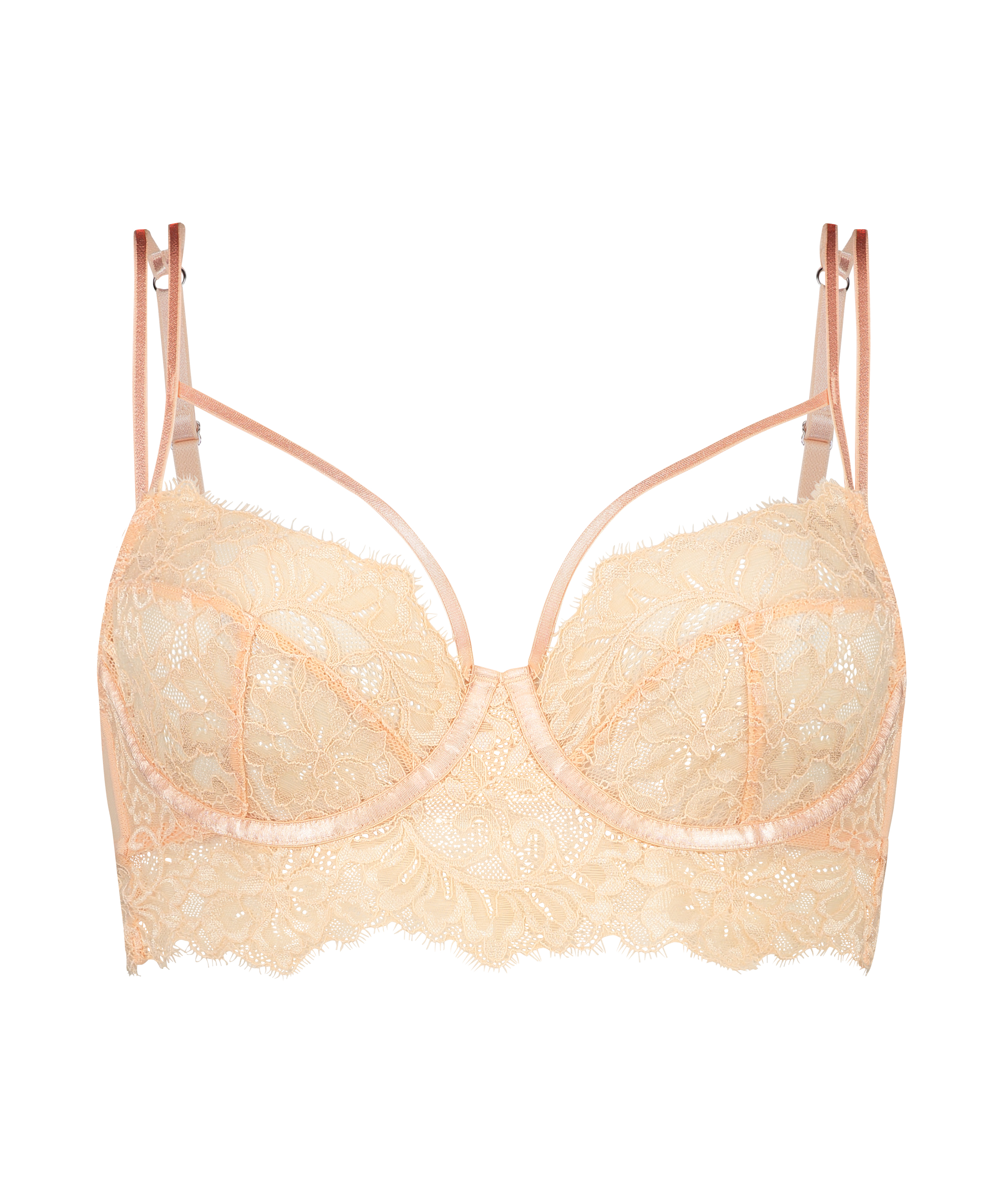Dette er den nye bh, du må eje! Den er dækket af sensuelle blomstrede blonder og stropdetaljer i en longlinemodel. Bøjlen giver støtte, og de justerbare stropper sikrer den perfekte pasform. Kombiner med matchende dele for at fuldende sættet!