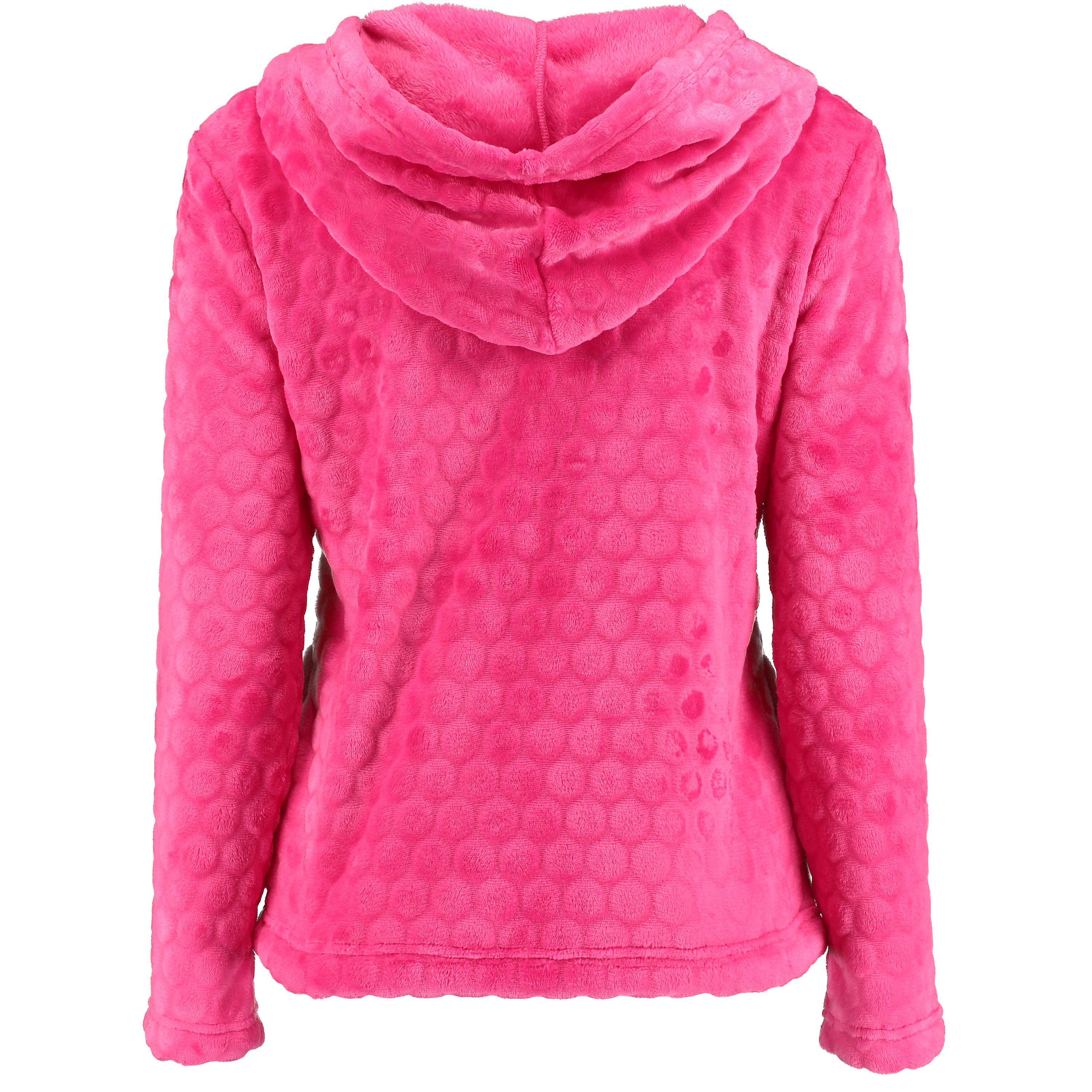 Quickly put on this jacket-style top over your pyjamas quickly and easily. The top is made from bright pink fabric and has a hood and two pockets.