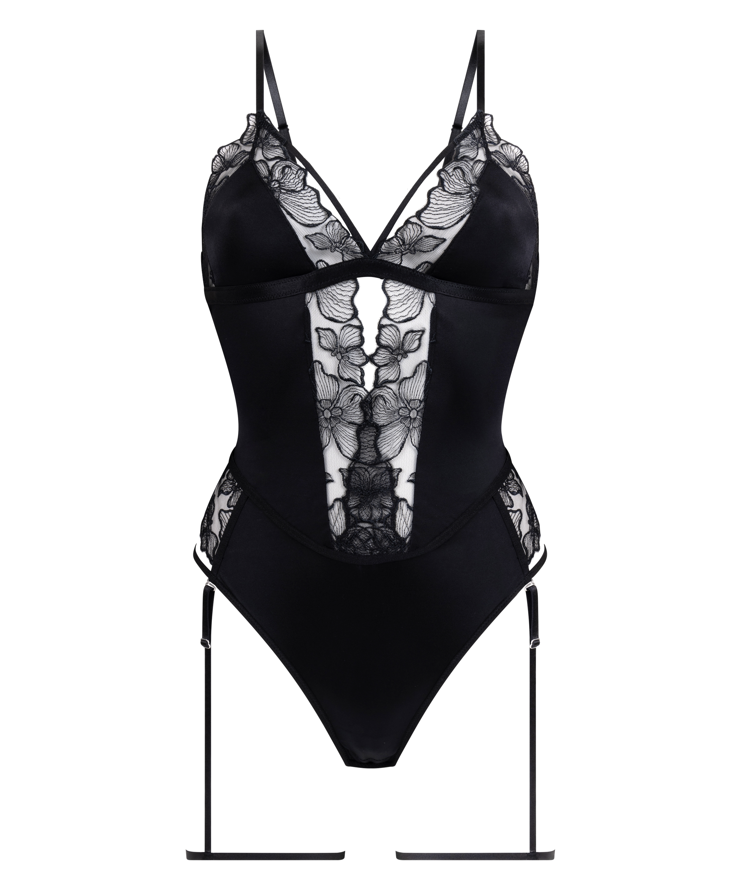 Skru op for forførelsen med vores body, der er både er dristig og sofistikeret og designet til at give et statement. Denne body kombinerer sarte blonder og silkeagtig satin og giver en luksuriøs fornemmelse og et fængslende udseende. En udskæringsdetalje foran tilføjer et flot touch. Det aftagelige strømpebånd giver alsidige stylingmuligheder, så du nemt kan tilpasse dit look.
