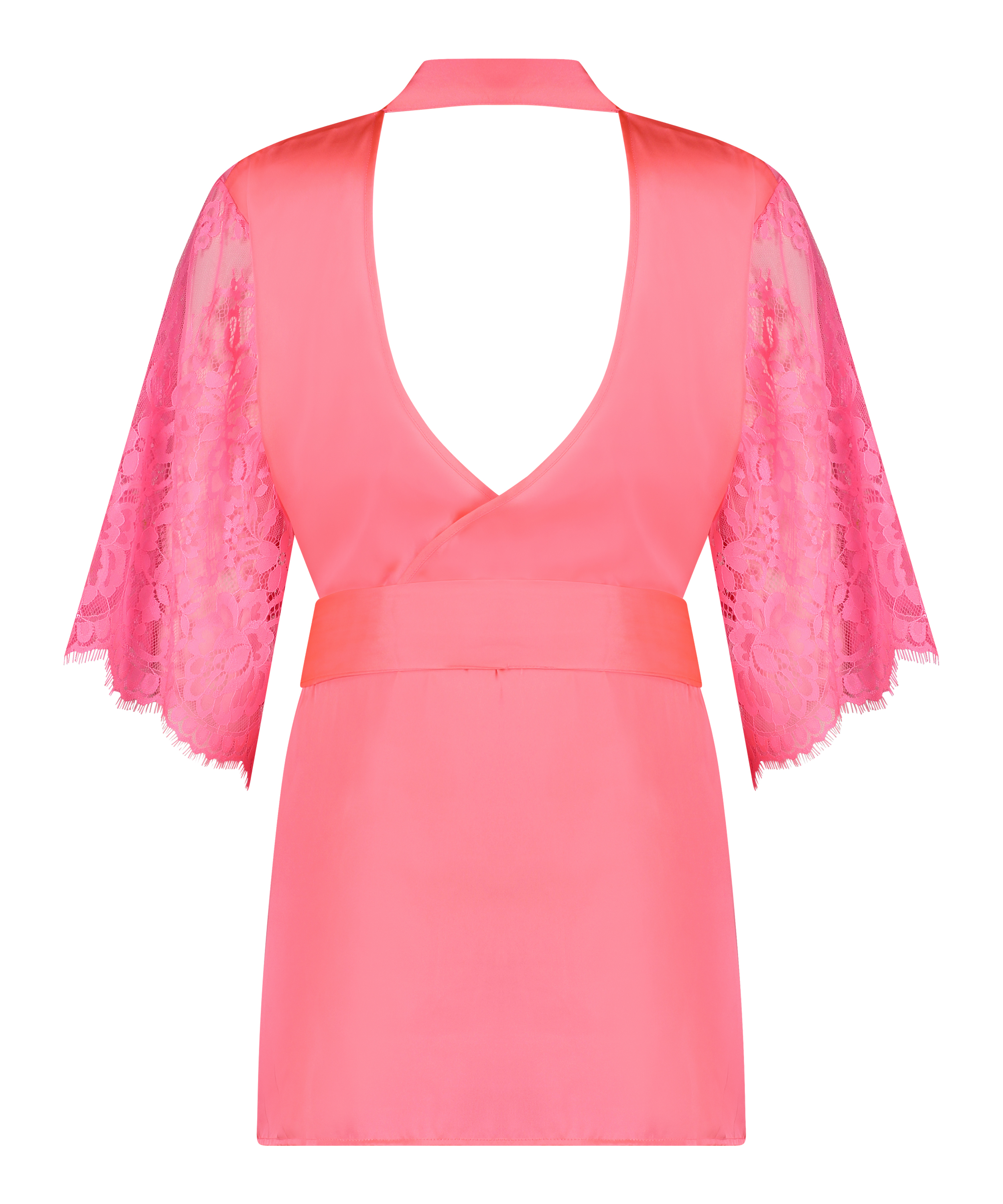 Kimono, som ser ud og føles som satin. De vide ærmer med blonder gør dit outfit supersexet. Den må ikke mangle i din garderobe! Kombiner med en flot natkjole for et fuldendt look. En artikel fra Private-kollektionen.