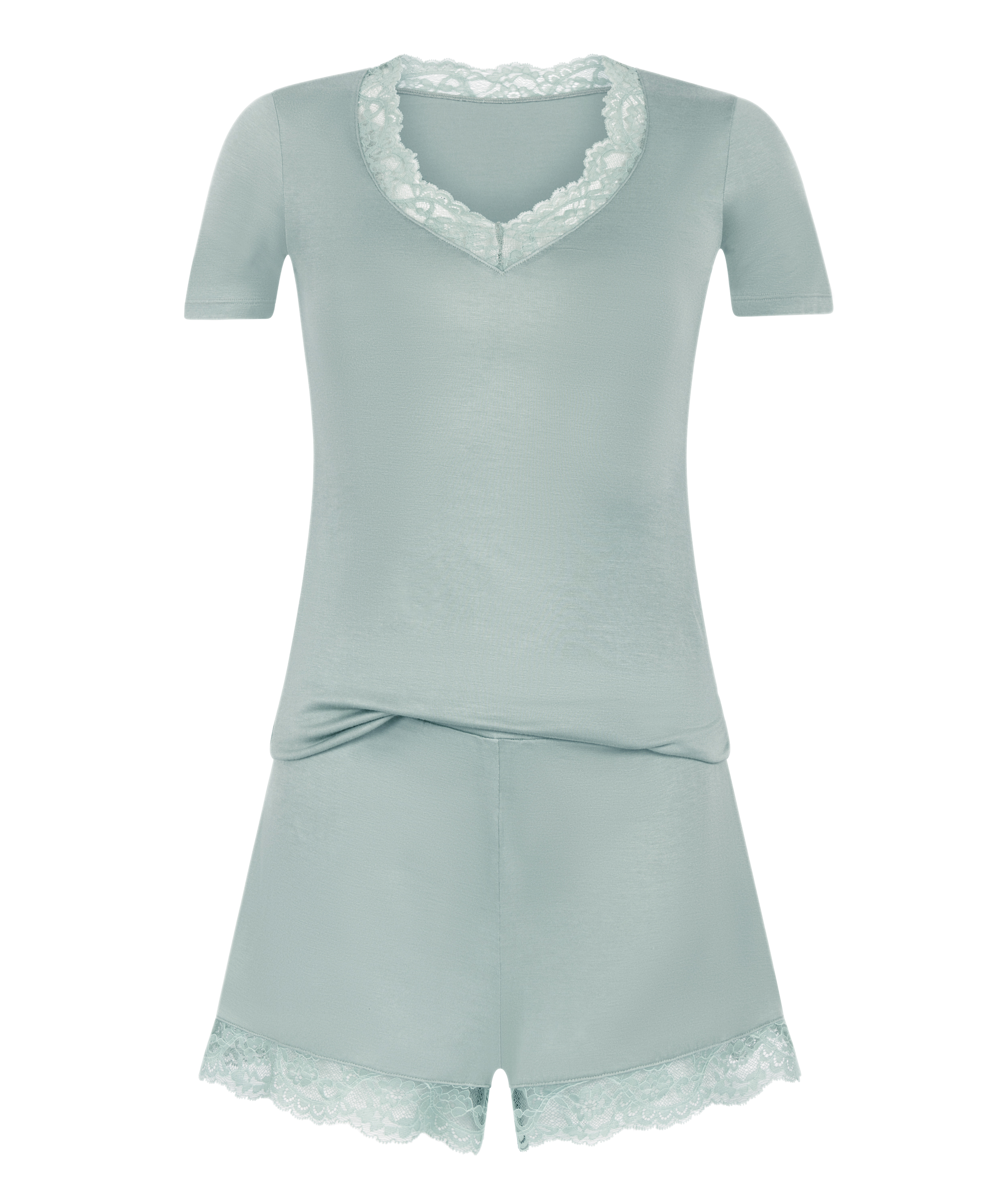 Slap af med stil i denne pyjamas, en perfekt kombination af stil og lethed. Dette sæt omfatter en t-shirt med matchende shorts, begge fremstillet af blødt jerseystof for en afslappet pasform. Blondedetaljerne tilføjer et romantisk touch til designet, mens shortsene har en elastisk linning for ultimativ komfort og lette at bære.