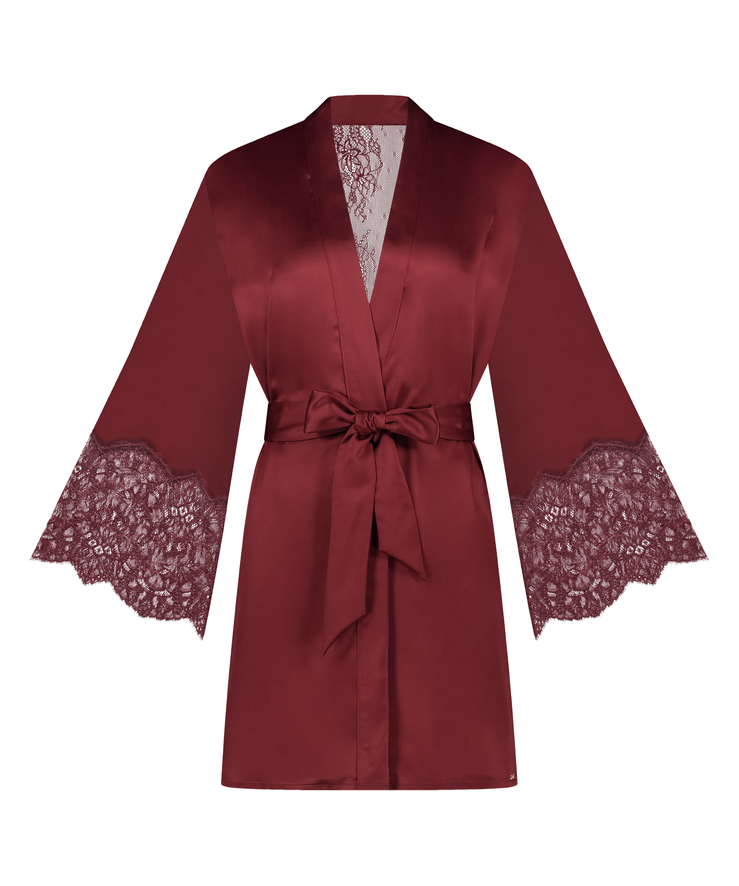 Gå ikke glip af denne elegante kimono! Den har masser af romantiske blonder og en rigtig bindelukning. Denne yndige kimono har brede ærmer og er lavet af satinmateriale, der giver den et luksuriøst look. Kombinér med matchende dele. En del af vores Noir kollektion.