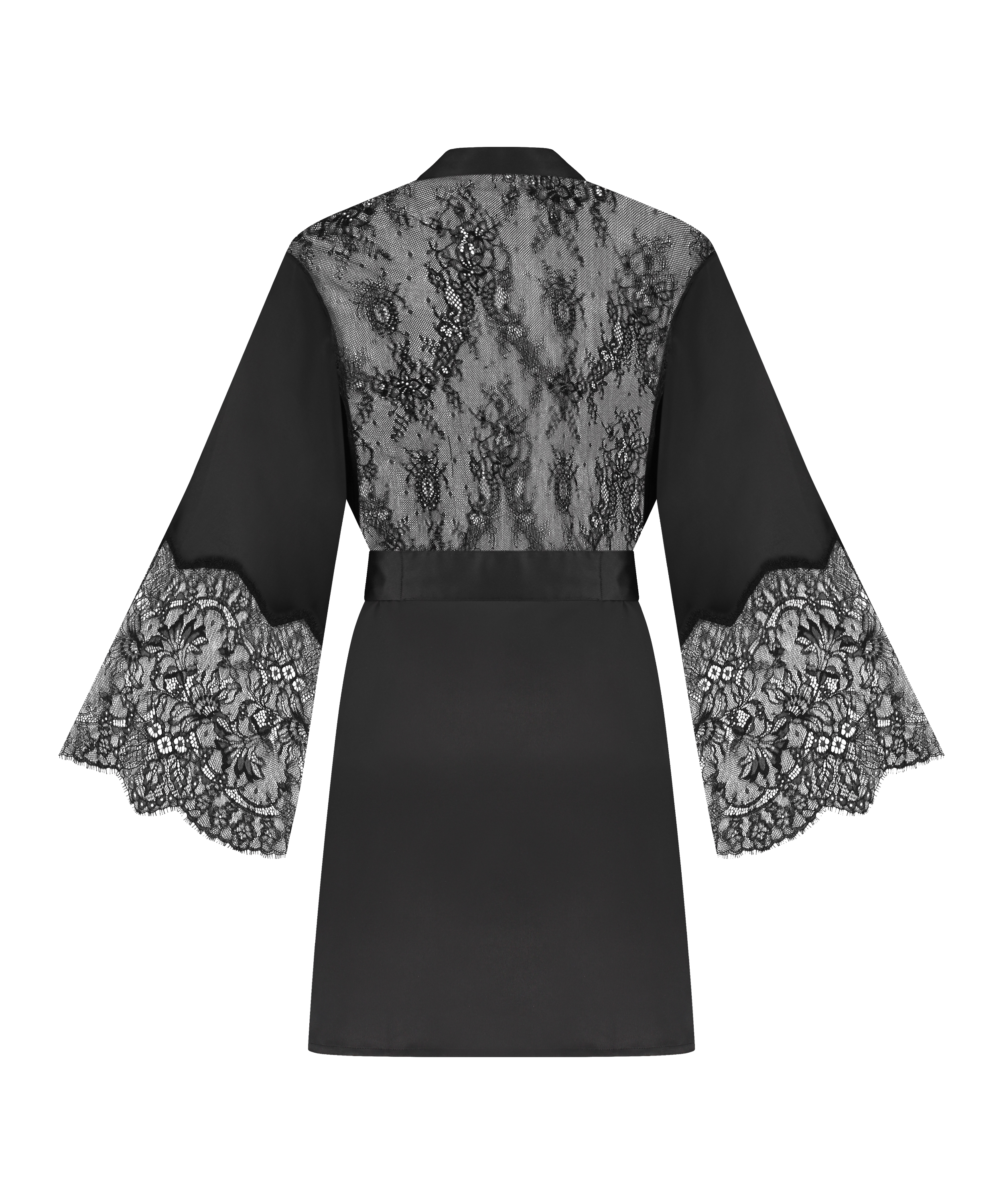 Gå ikke glip af denne elegante kimono! Den har masser af romantiske blonder og en rigtig bindelukning. Denne yndige kimono har brede ærmer og er lavet af satinmateriale, der giver den et luksuriøst look. Kombinér med matchende dele. En del af vores Noir kollektion.