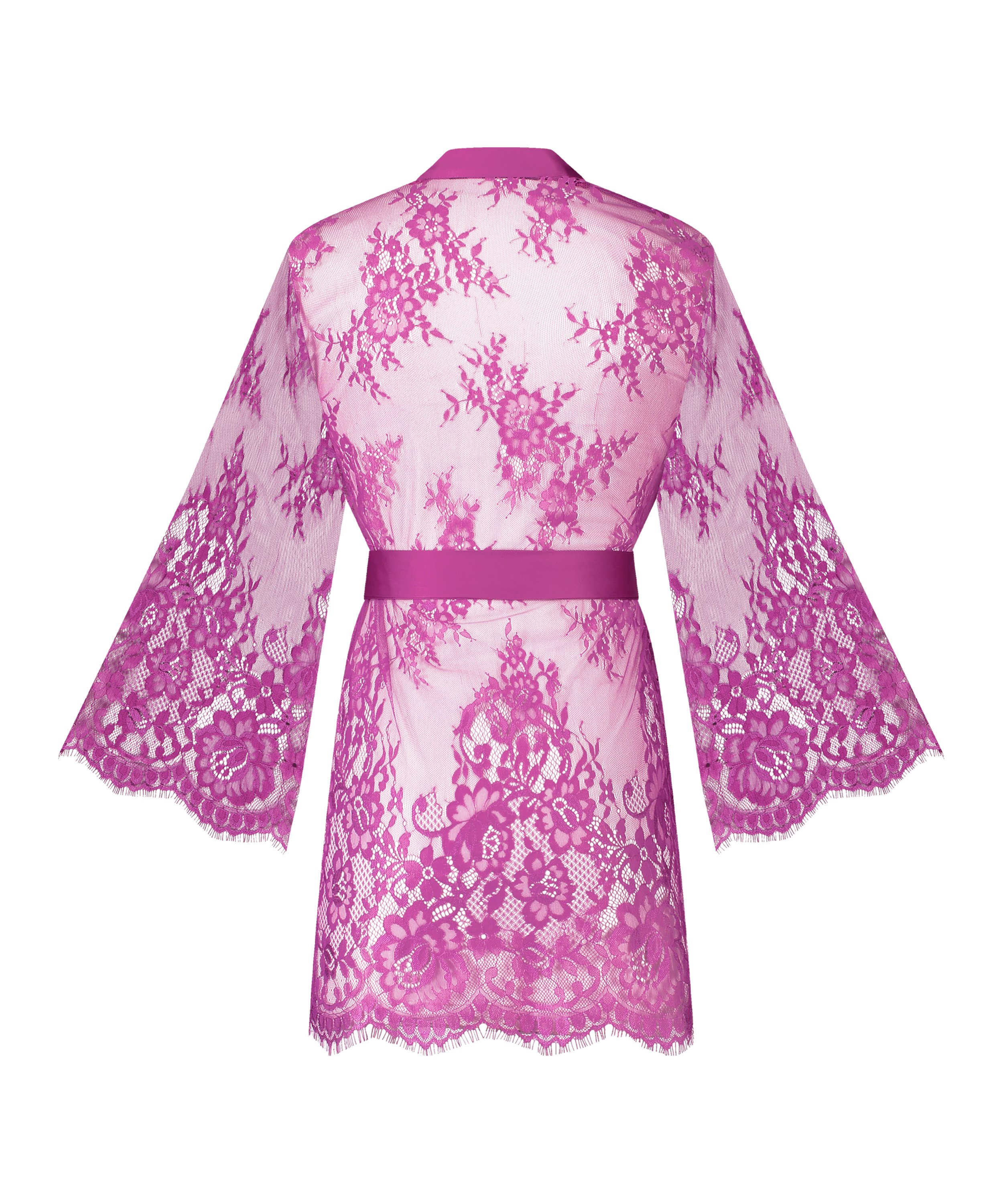 Blondestof, sexappel, femininitet. Denne kimono har det hele! Den er udført i gennemsigtigt blondestof, og har smukke satin detaljer. Du kan knappe den foran.