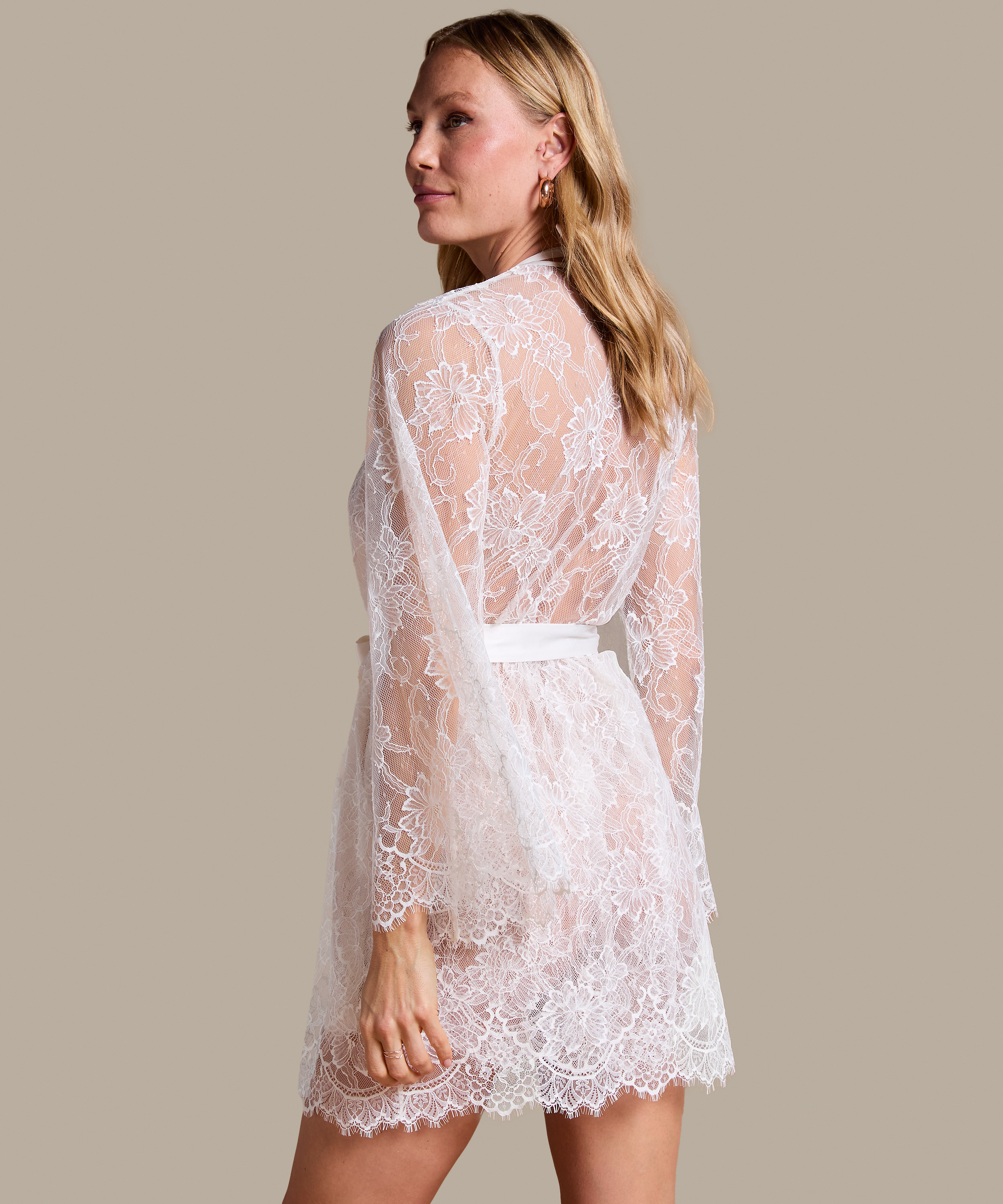 Du vil elske denne blondekimono! Den har et halvtransparent look med satinbånd og frontal bindelukning. Bær den med den matchende underkjole! En del af vores Noir-kollektion.