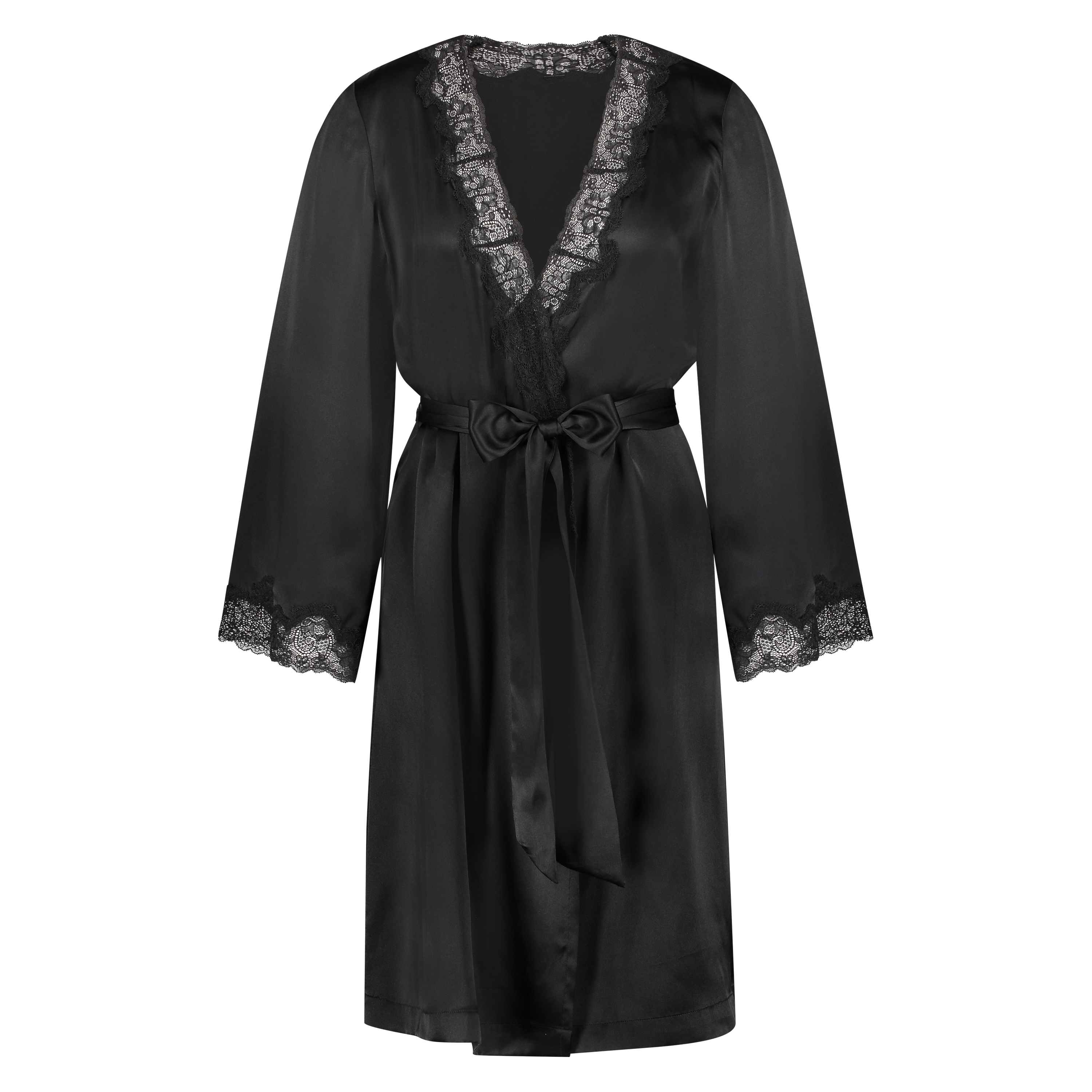 Denne kimono er lavet i silke og føles superblød mod huden! Kimonoen har blondedetaljer ved ærmerne og foran. Den indgår i vores luksuriøse Noir Collection. Kombiner med matchende dele.