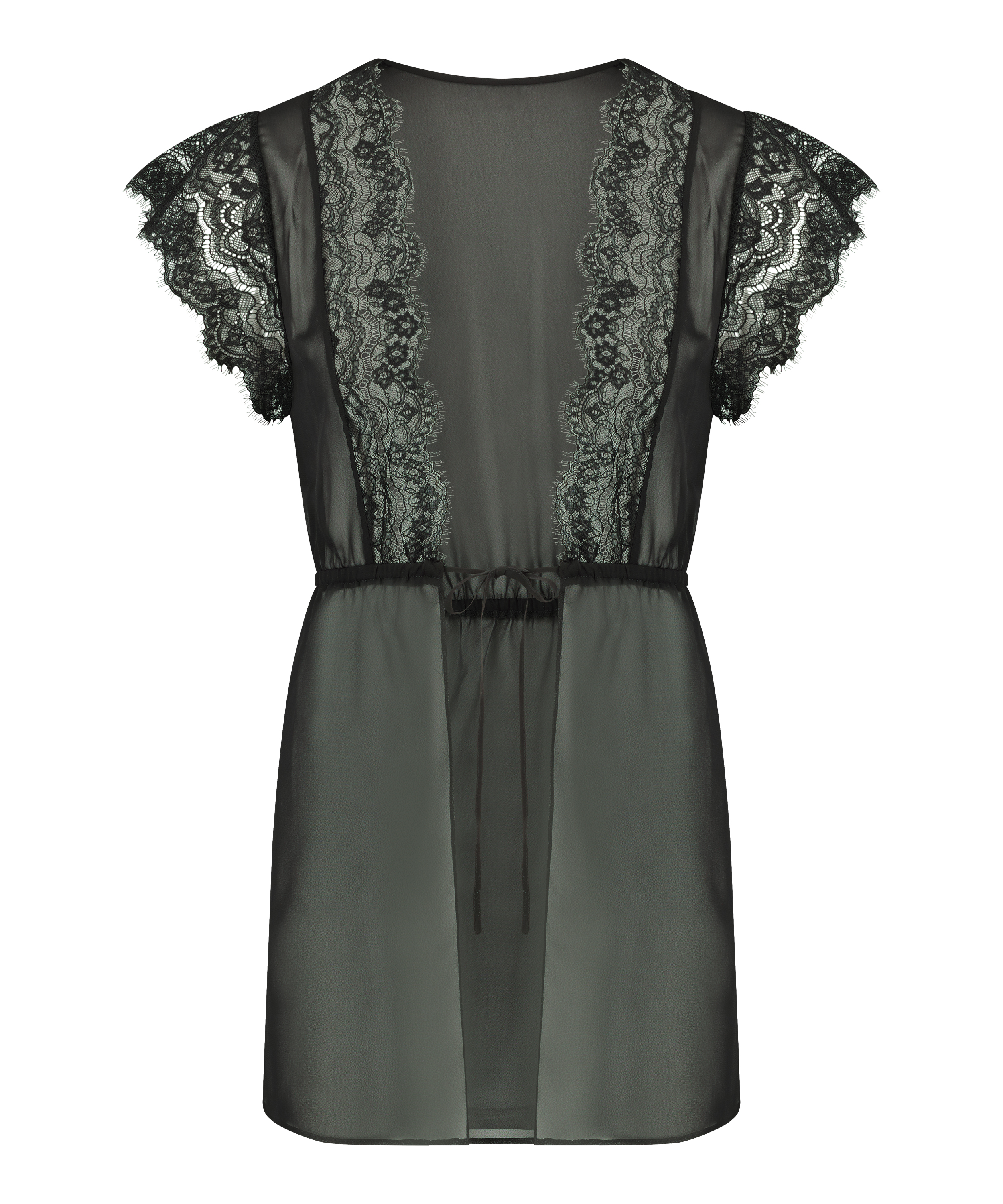 Vis dig frem i denne super sexede kimono! Med et semi-transparent look og masser af blonder! Du kan binde den til med et bånd foran, så den passer perfekt til din krop. Look med slids på benene i begge sider. Sæt den sammen med et matchende sæt!