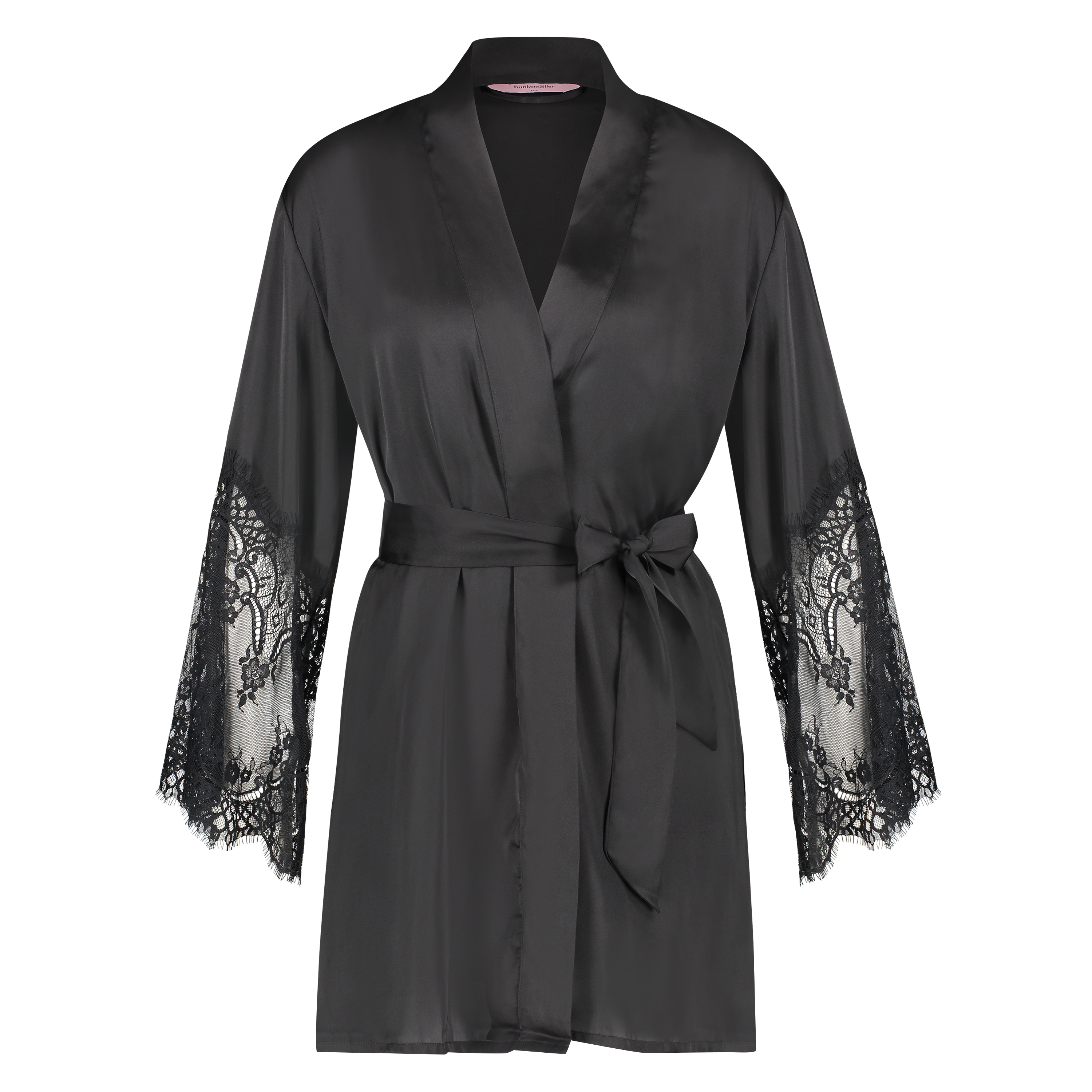Gør dit lingerisæt endnu mere forførende med denne kimono! Stoffet ser ud og føles som satin og er pyntet med blonder.