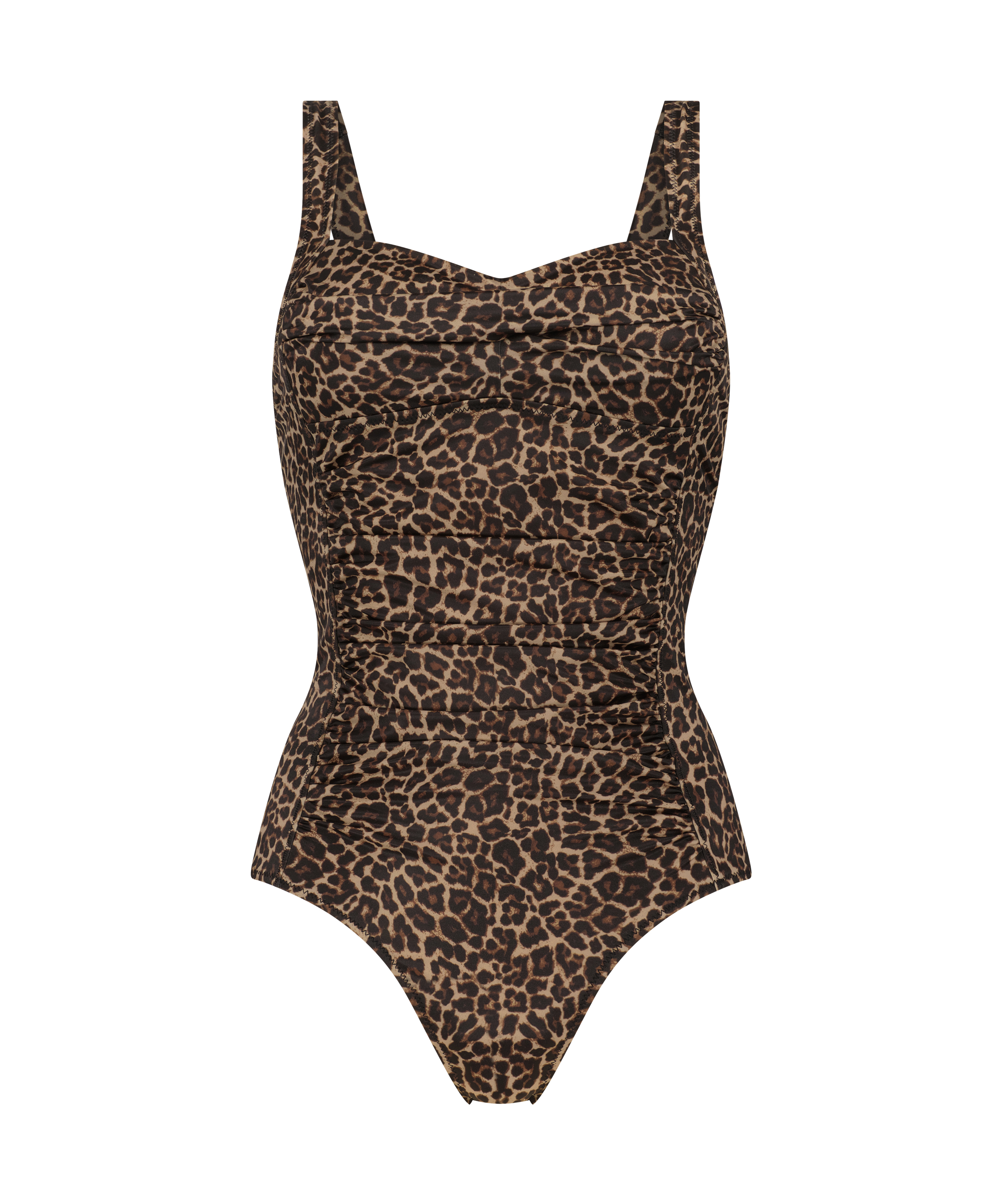 Denne badedragt er en absolut must-have! Leopardmønstret er topmoderne! Afsluttet med en ringdetale over skålene.