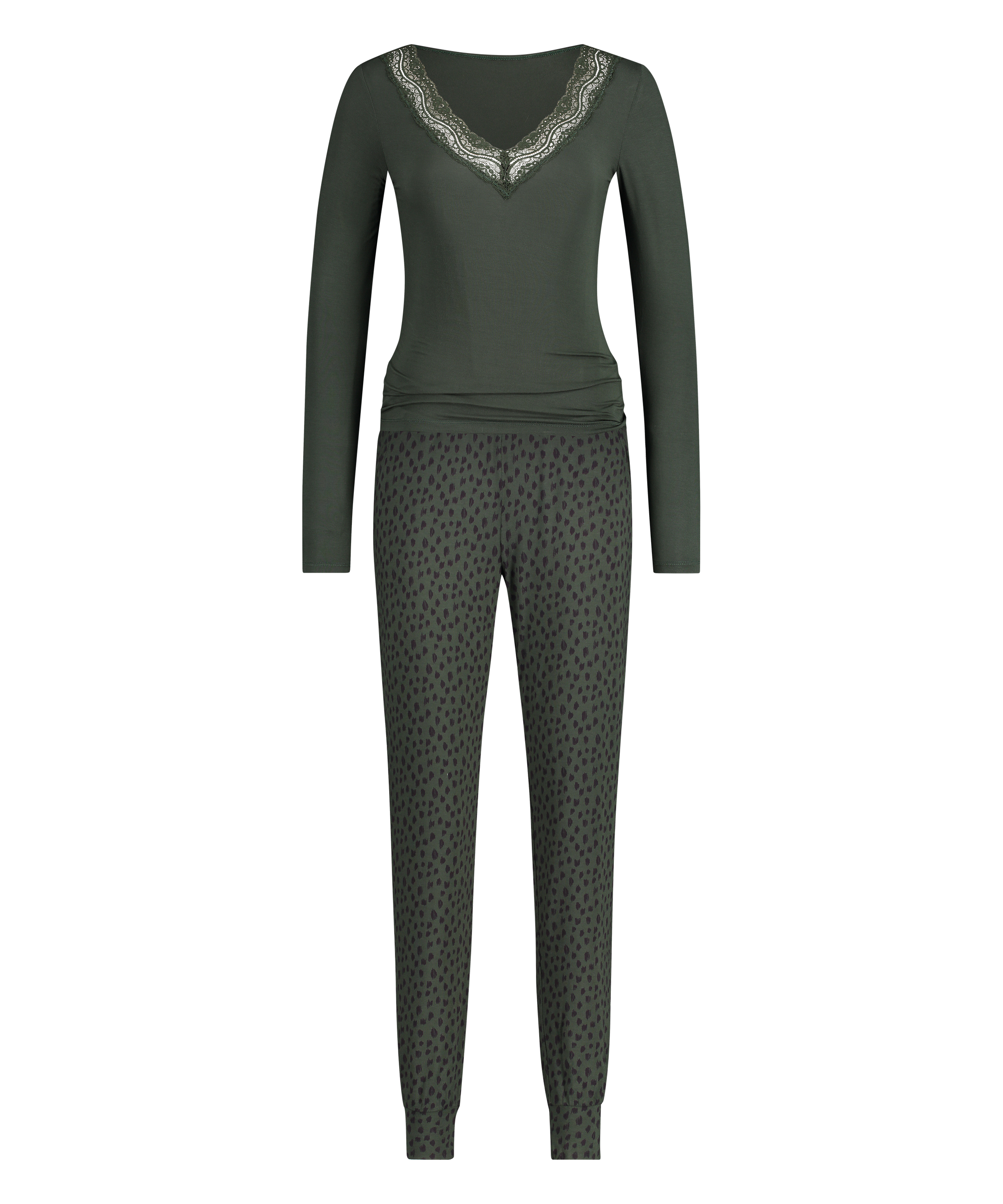 Du kommer til at sove godt i dette behagelige pyjamassæt! Toppen har blondedetaljer, og bukserne har et print.