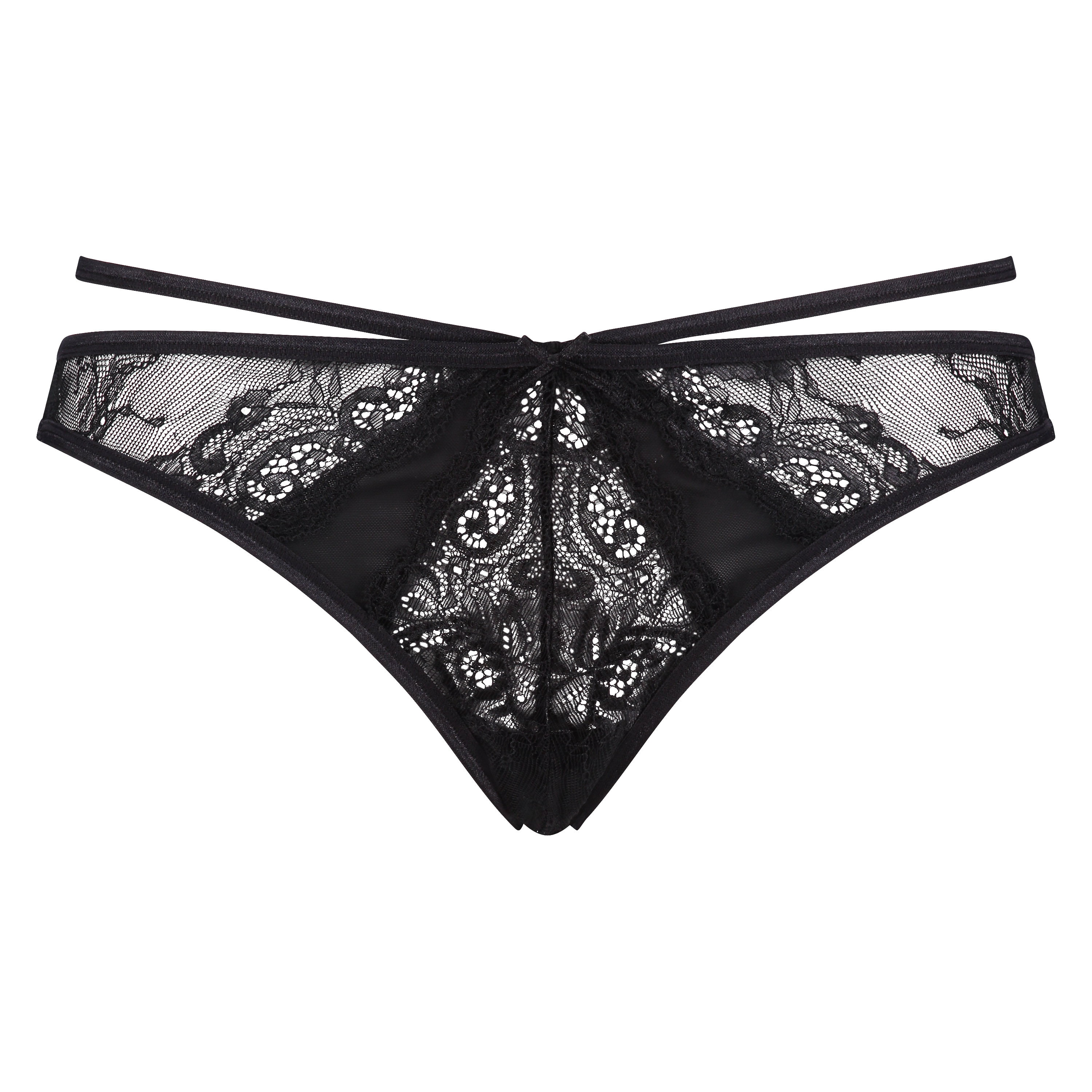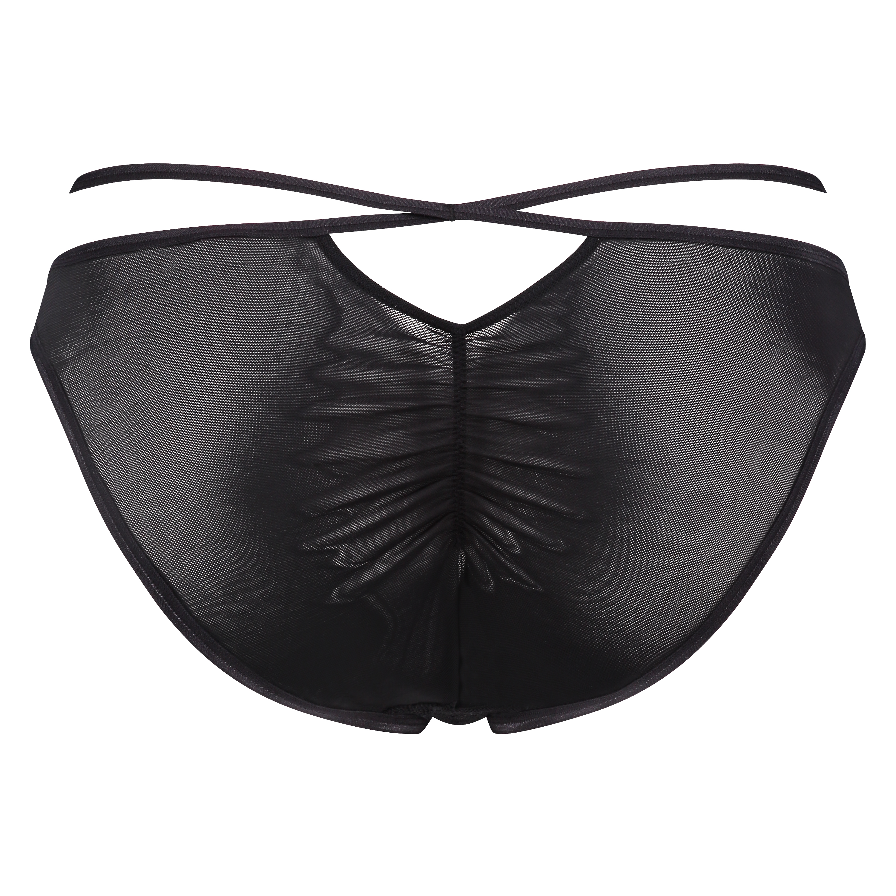 Sexet brasiliansk trusse med blondeforstykke. Bagstykket er rynket og helt i halvtransparent materiale med sexet cut-out-detalje.