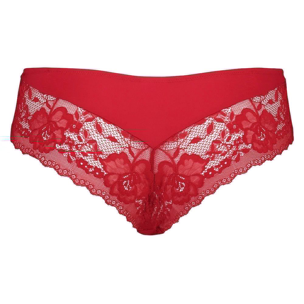Brasiliansk trusse i halvtransparent blondestof og skinnende stof. Med lille, dekorativ sløjfe foran. Kombiner trussen med en matchende bh og fuldend dit sæt!