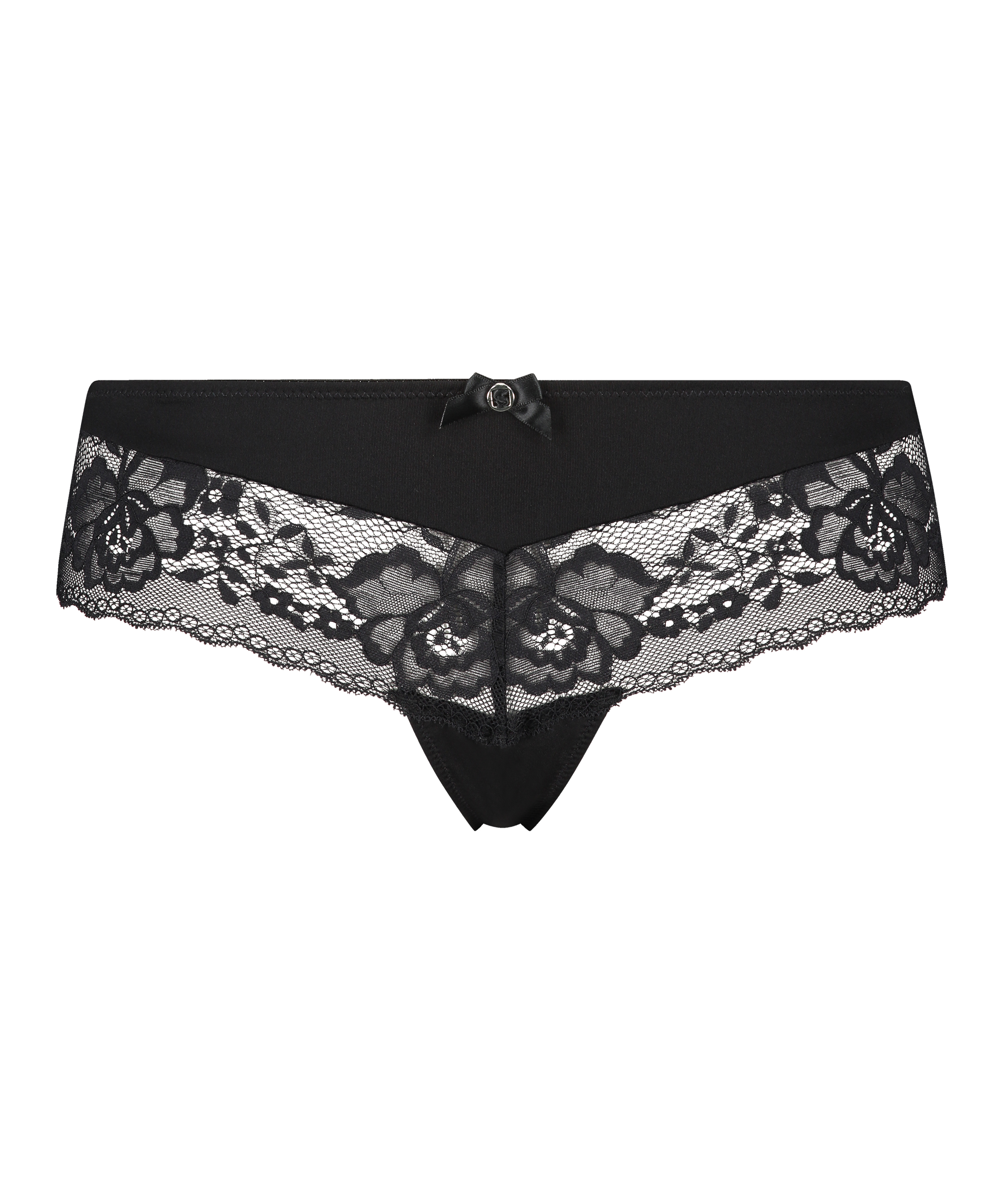 Brasiliansk trusse i halvtransparent blondestof og skinnende stof. Med lille, dekorativ sløjfe foran. Kombiner trussen med en matchende bh og fuldend dit sæt!