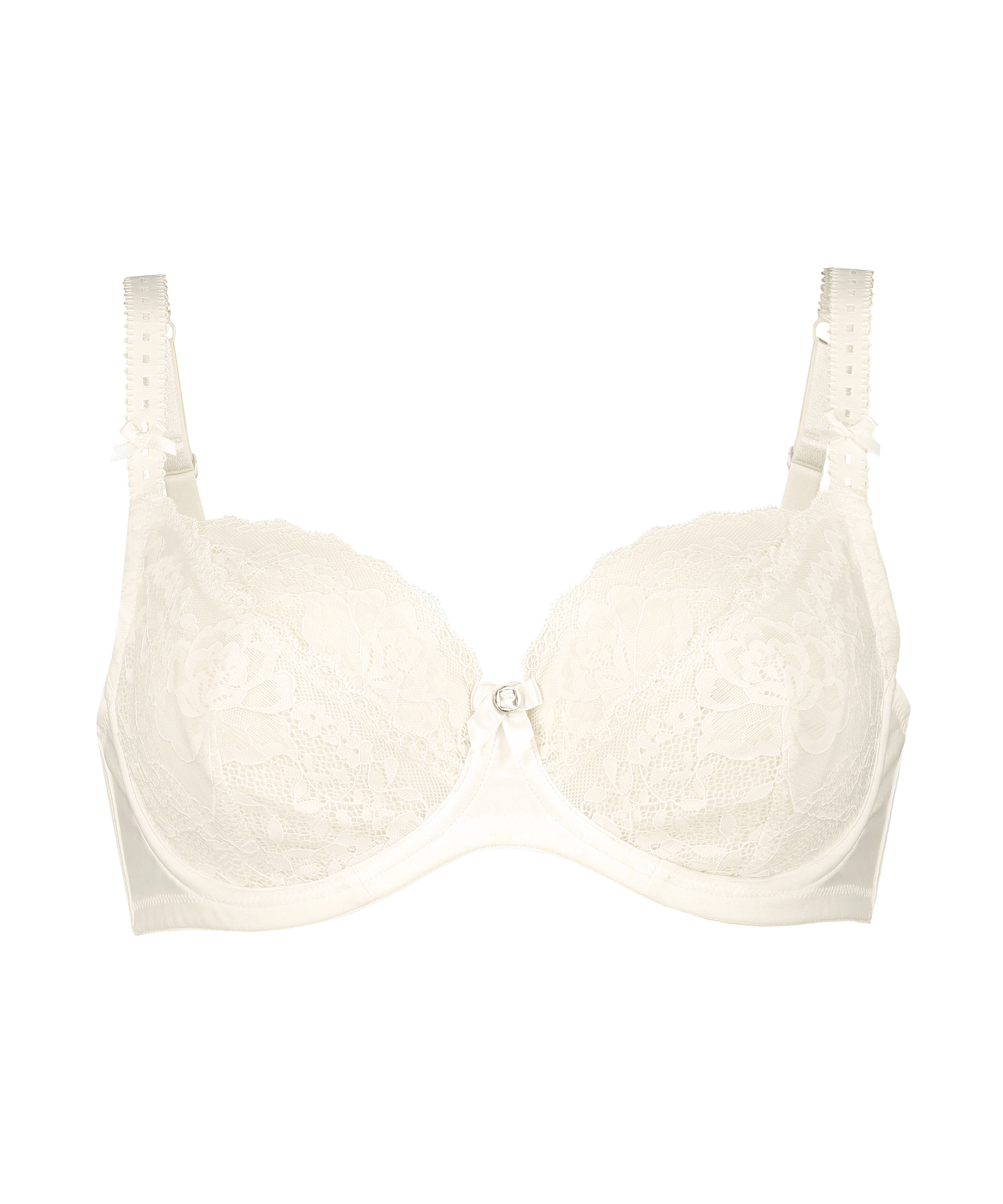 Ikke-formstøbt bøjle-bh med halvtransparent blondestof på skålene. Skulderstropperne er dekoreret, og bh'en har små sløjfer på skulderstropperne og mellem skålene.