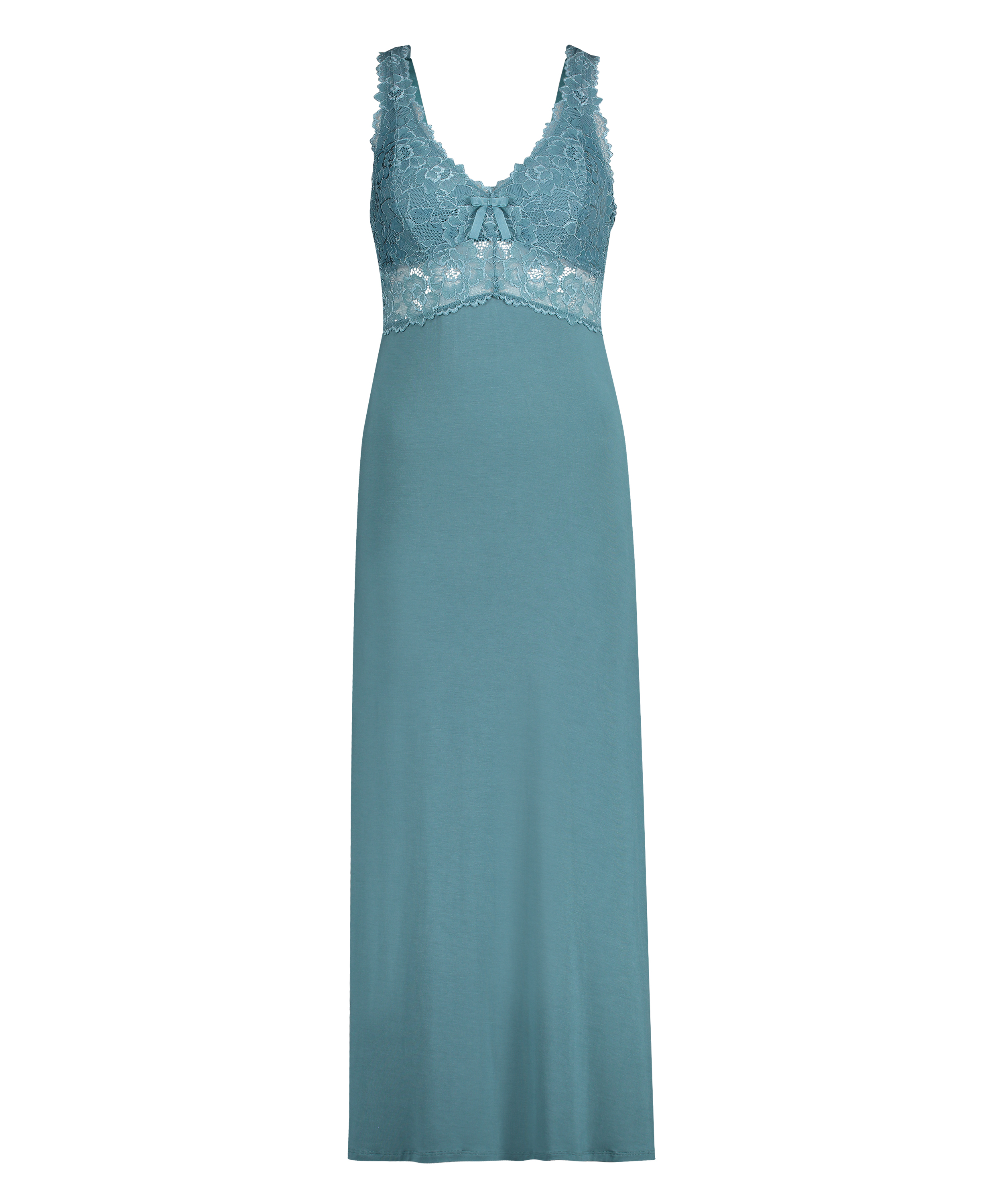 Denne smukke natkjole vil se godt ud på dig! Natkjolen er lidt længere og har blondedetaljer. Den er også meget behagelig at have på! Kombinér med en matchende kimono for et komplet look!
