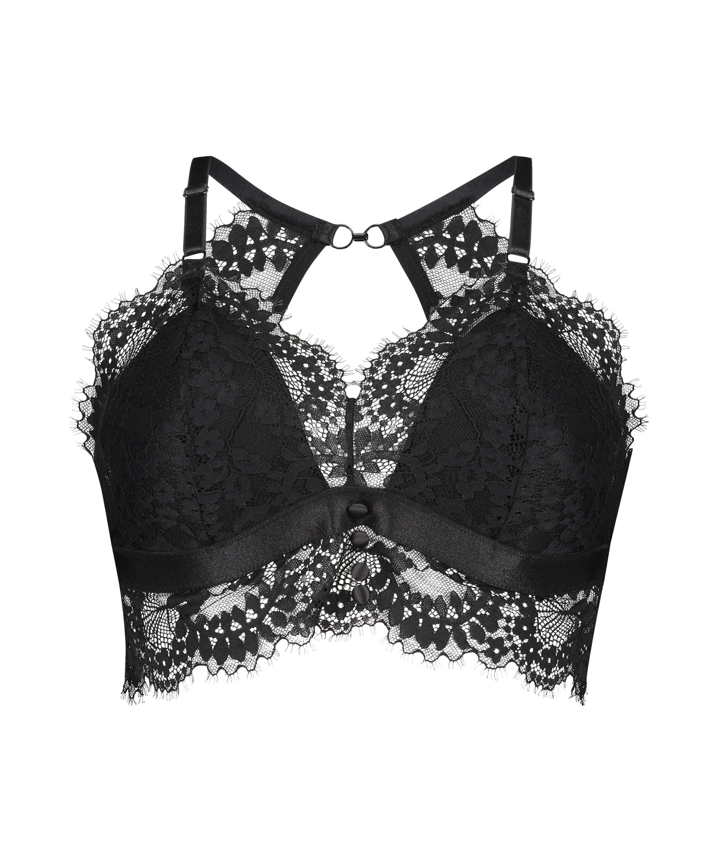 Bliv bemærket med denne smukke bralette! Braletten er næsten helt dækket med blonder. Elastikbåndet under skålene er breddere, hvilket gør den mere behagelig. Skulderstropperne kan justeres. Kombiner denne smukke bralette med matchende trusser for at fuldende sættet! En del af vores Curvy-kollektion.