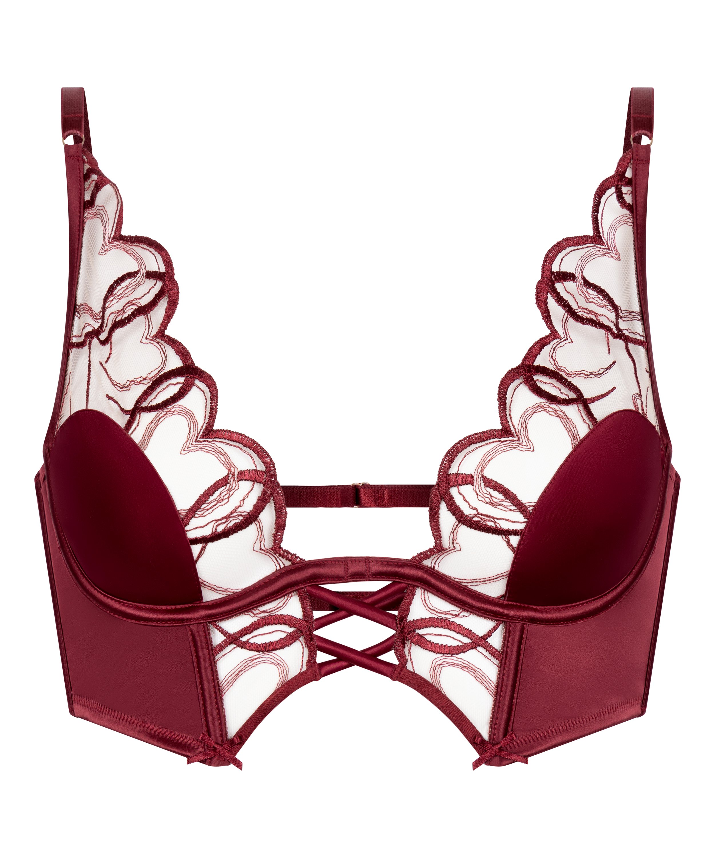 Leder du efter en bh, der både er romantisk og dristig? Denne skønhed i satin er udsmykket med delikat hjerteformet blonde og har en unik X-lukning bagpå for et flirtende twist. Den er uden vattering og har bøjler, og den tilbyder naturlig formgivning med elegant støtte. Den silkeagtige satin føles drømmende mod din hud, mens justerbare stropper holder den behagelig og sød. Kombiner med den matchende bustier eller trusser for et look, der er helt uimodståeligt!