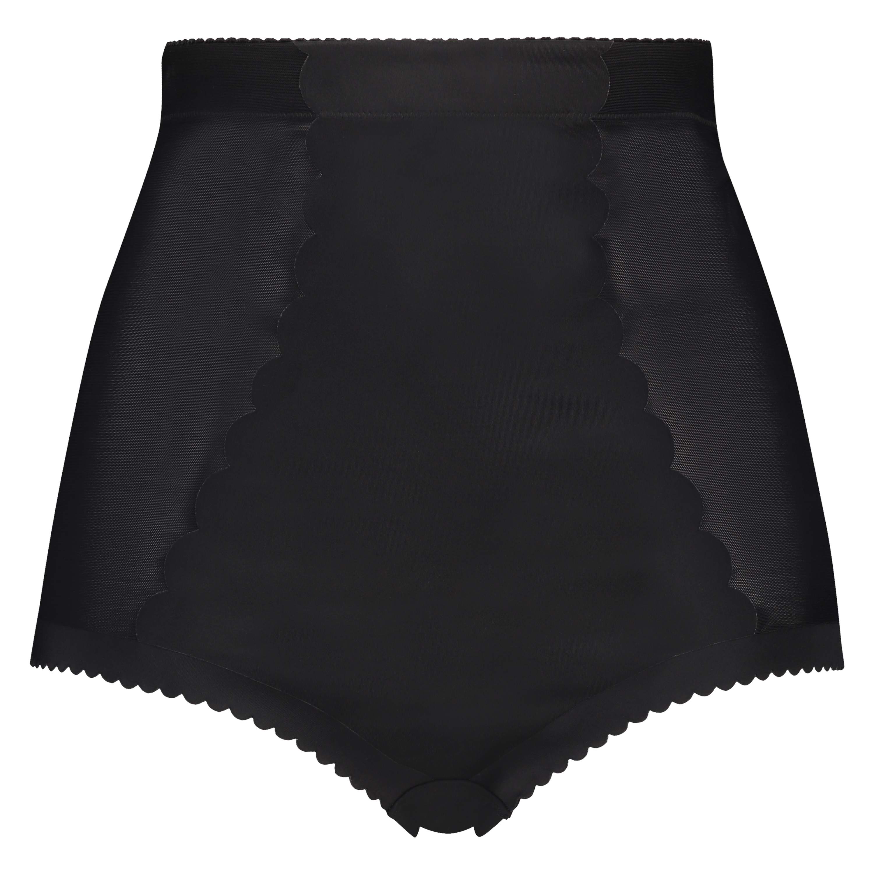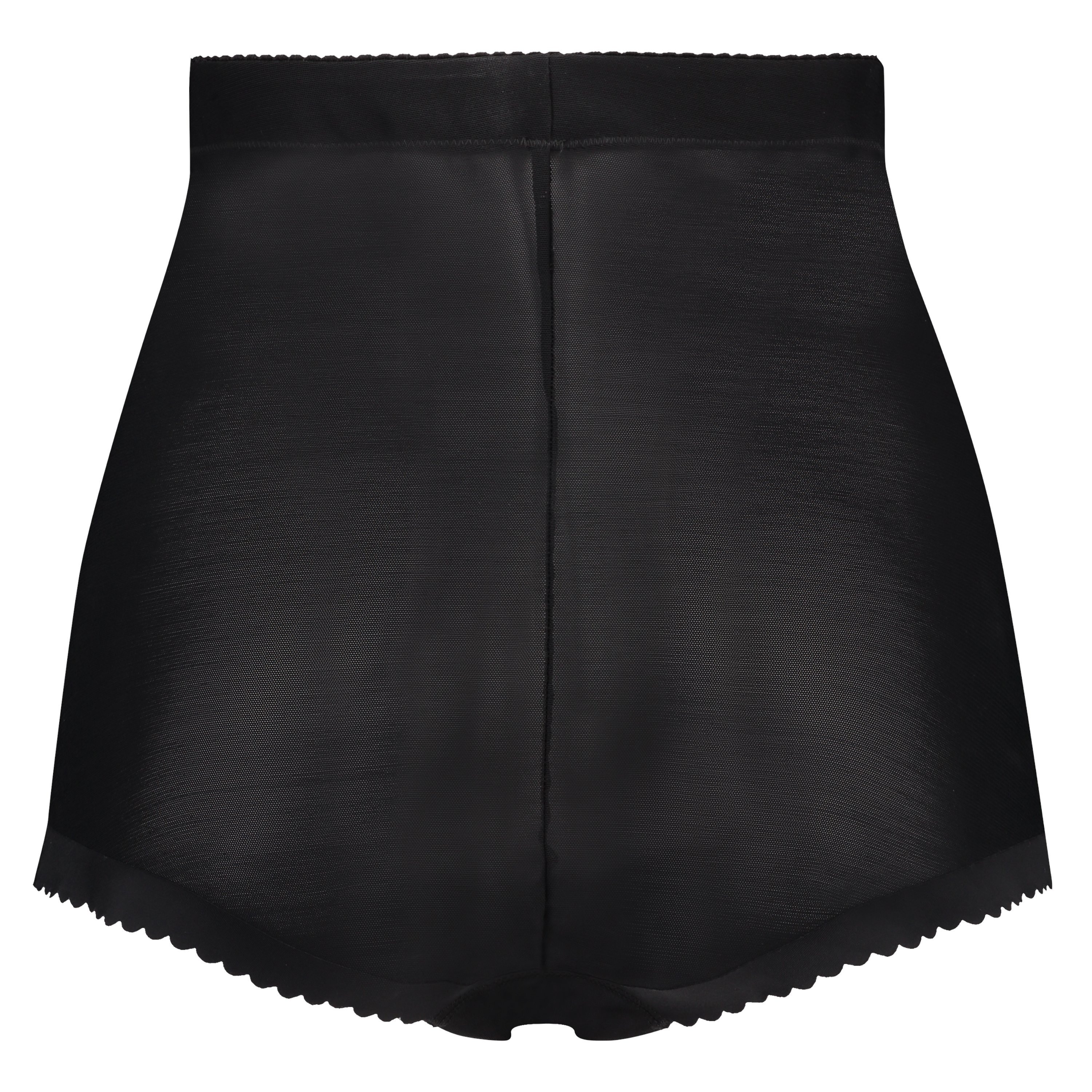 Flot høj trusse med korrigerende effekt på mave, hofter og lår. Trussen er i et halvtransparent materiale med dekorativt uigennemsigtigt stof på forstykke og kanter.