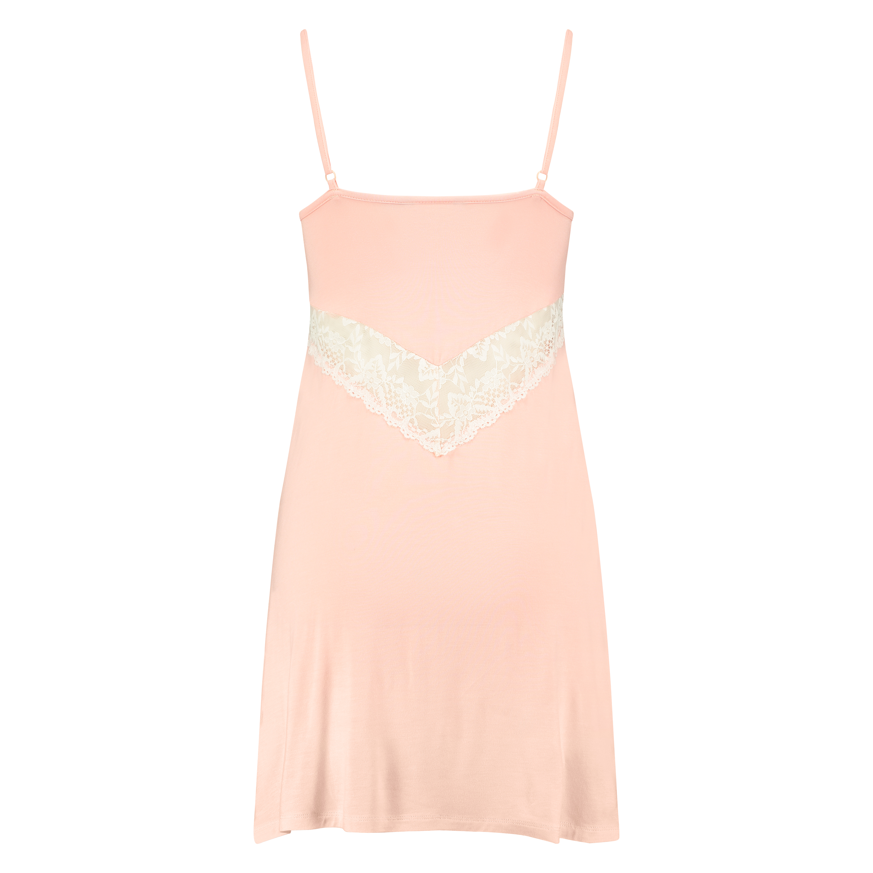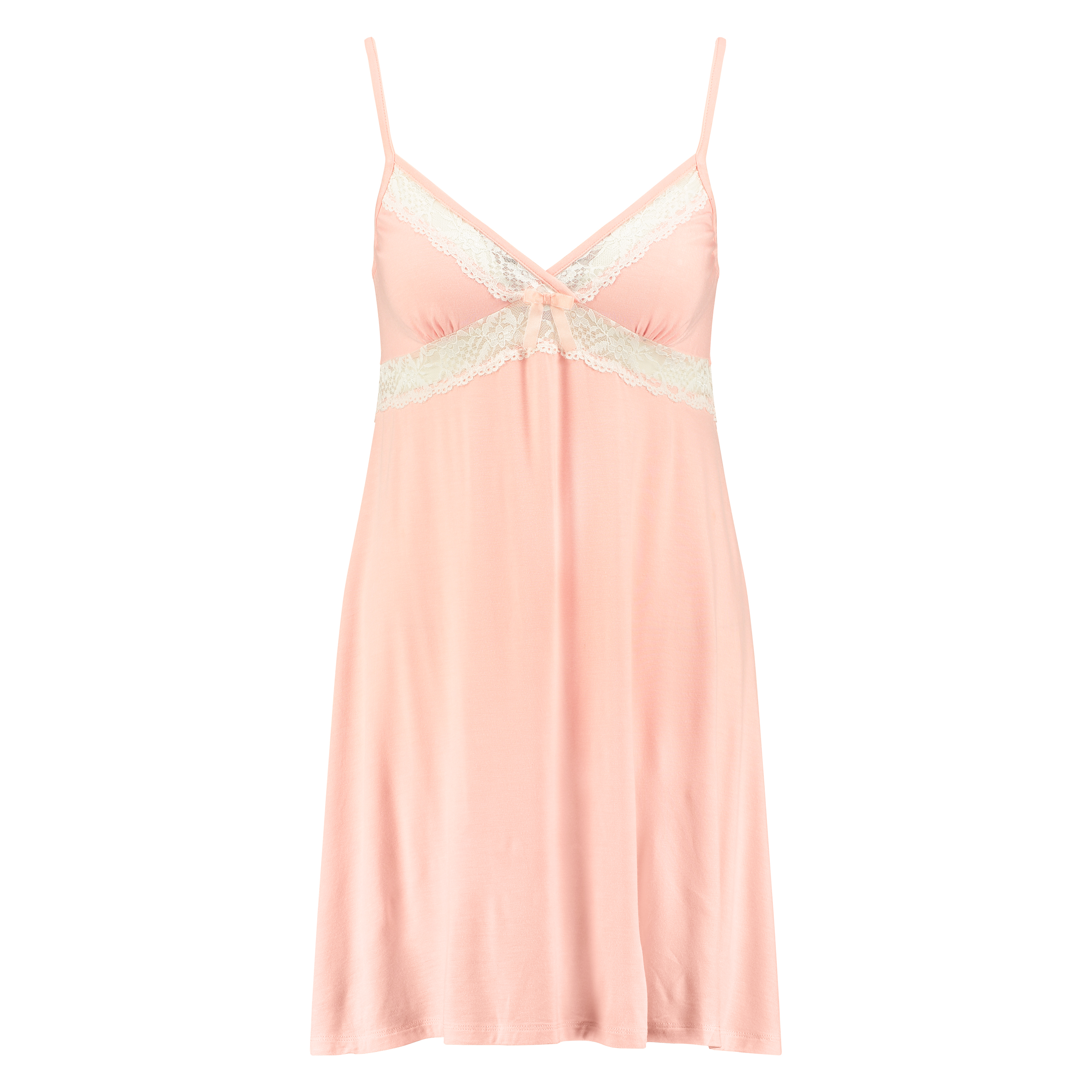 Lyserød natkjole med en dekorativ sløjfe foran og blondedetaljer. Modellen går til over knæet.